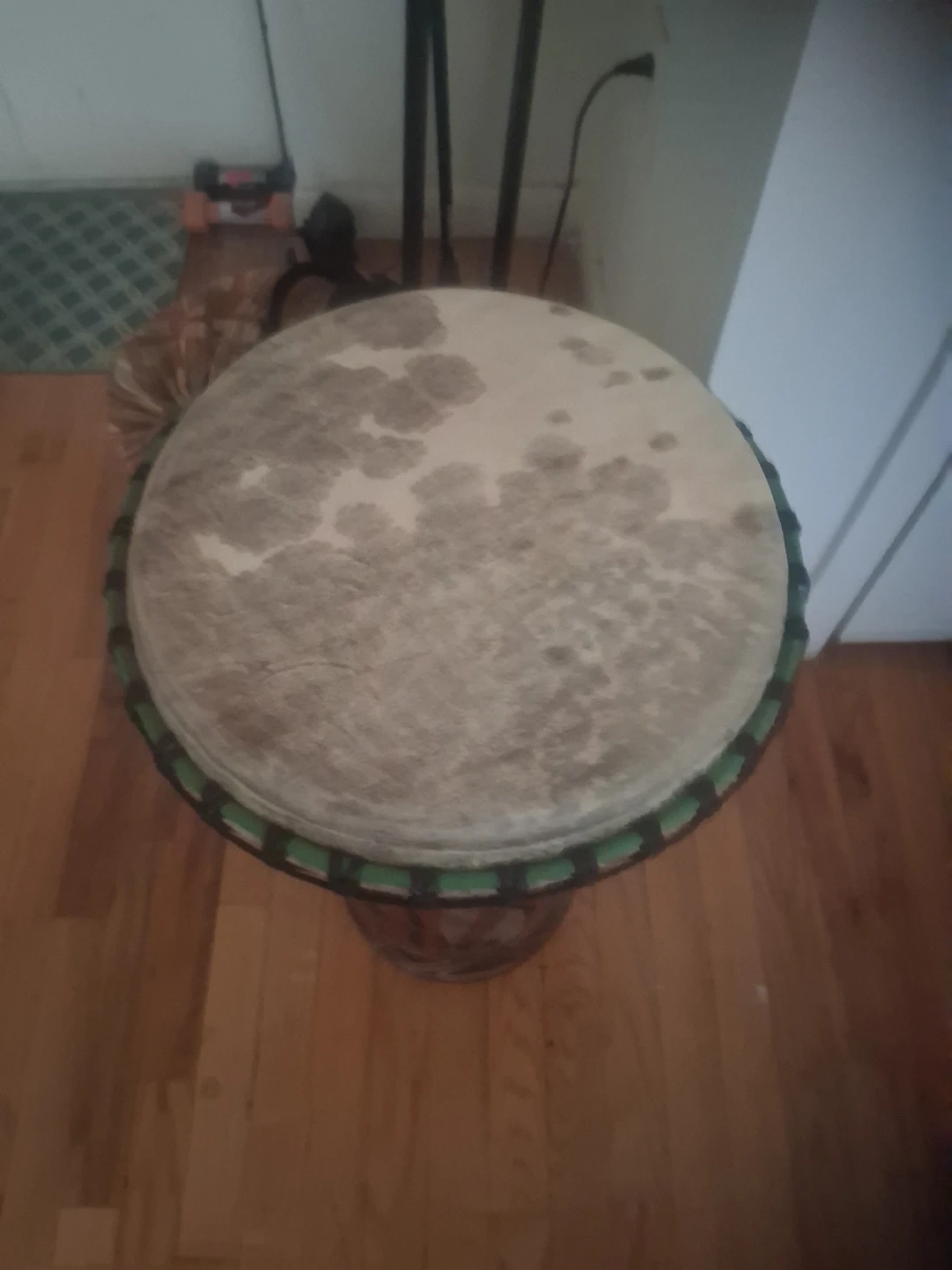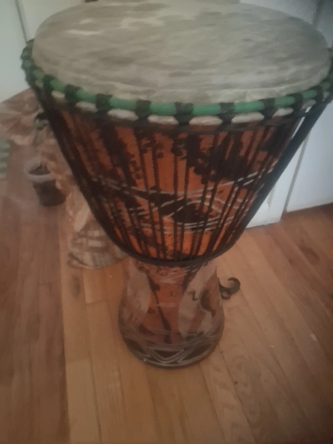 This is a djembe drum with a goatskin head.14 inches wide the skin head. It features a decorative, hand-painted wooden body. The drum is approximately 20 inches tall. This instrument is perfect for beginners or experienced percussionists. Great sound well made.
