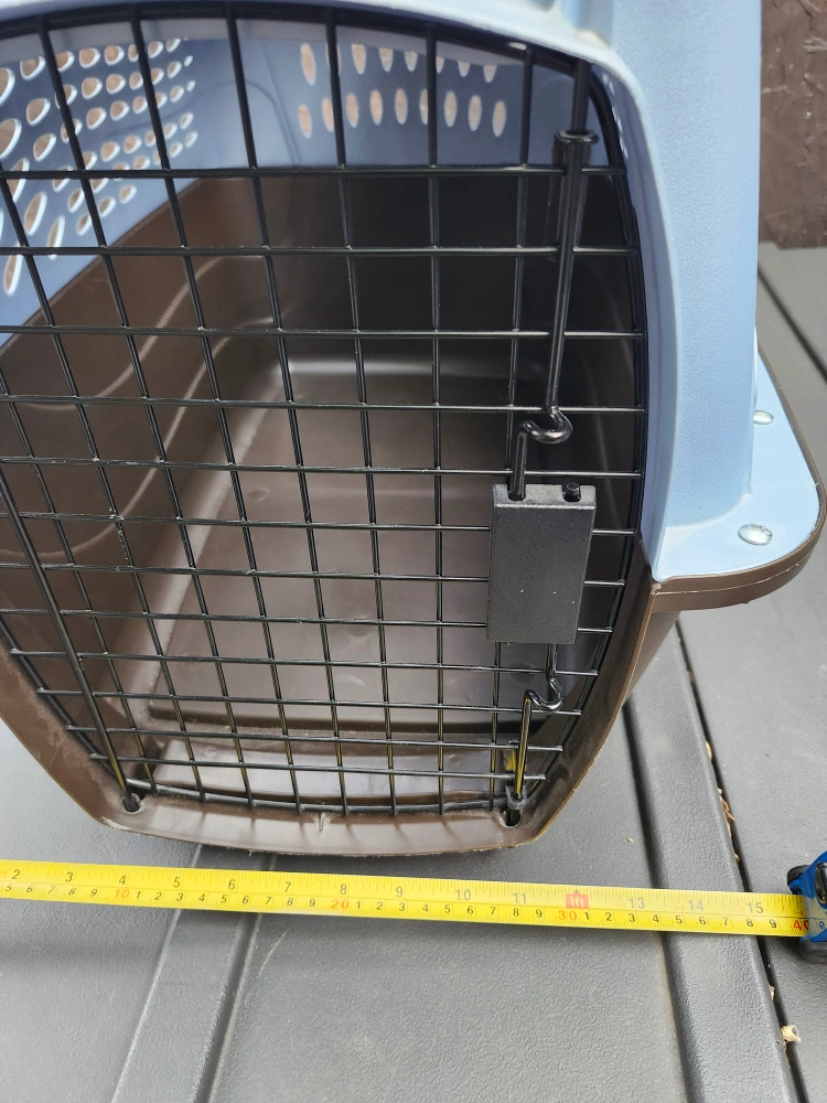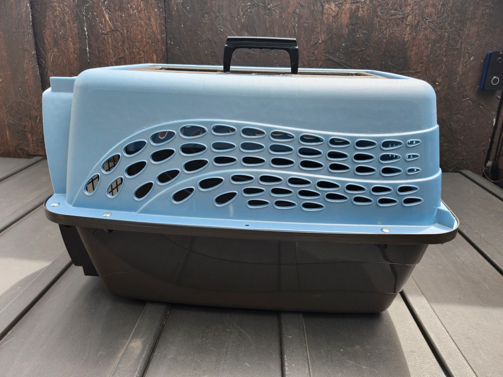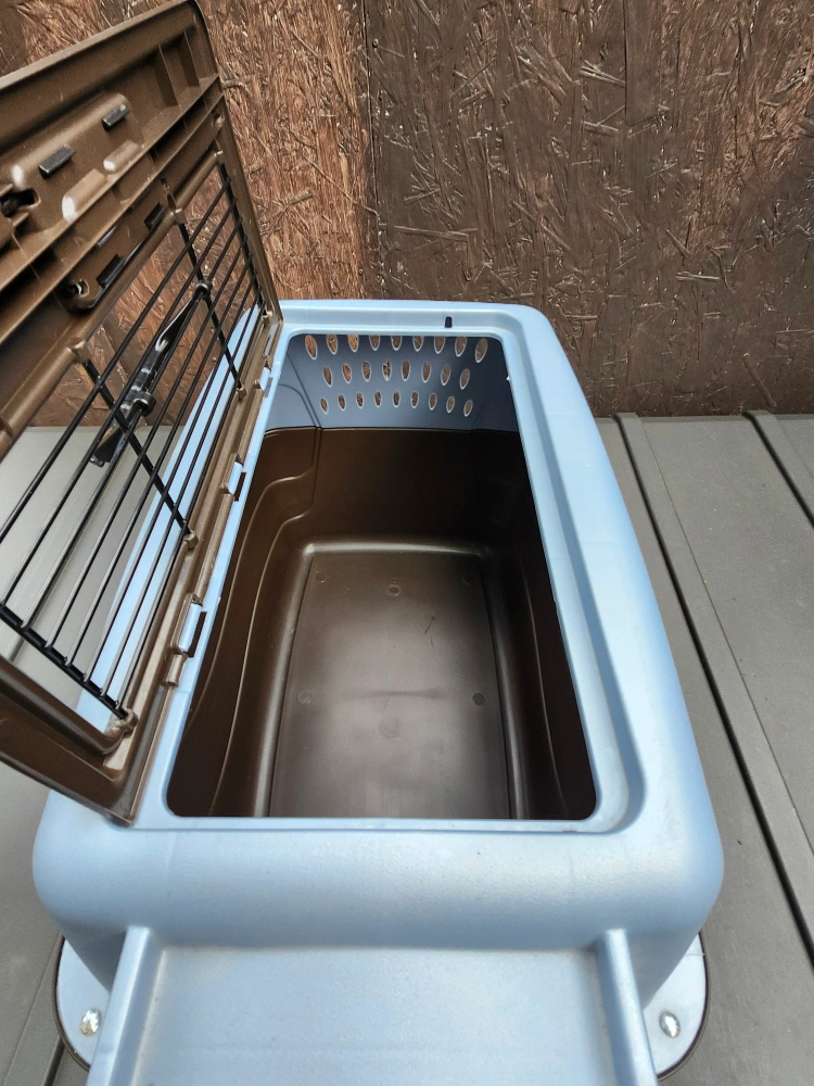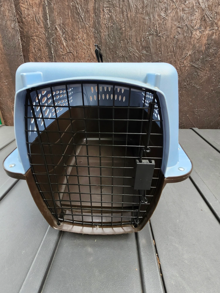 Carrier with a metal grate door. Features a locking mechanism. The top is blue and the bottom is brown. A perfect place for your pet to feel safe and secure while travelling. Also has a door on top