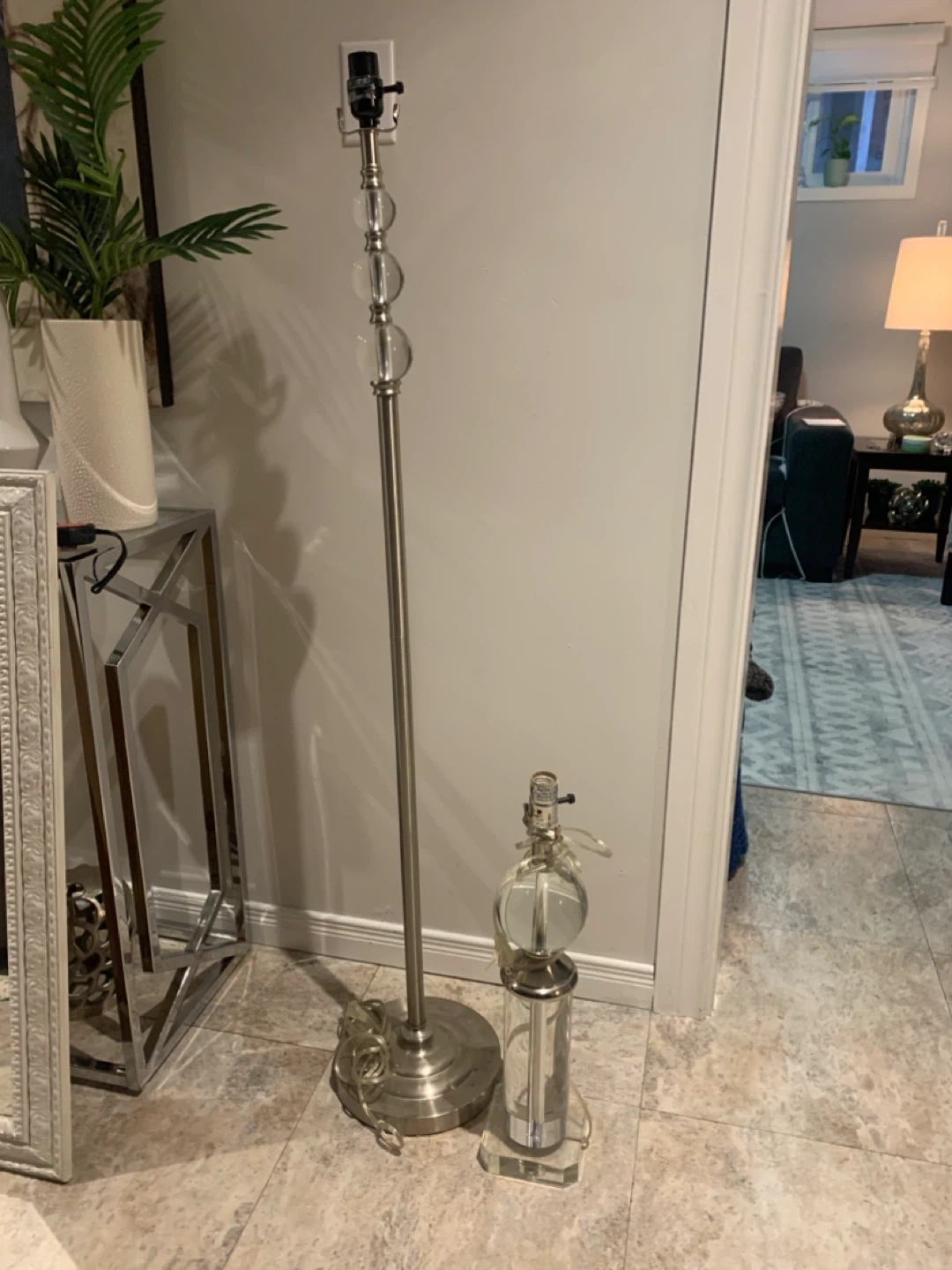 Selling a stylish floor lamp and matching table lamp set. Both lamps feature crystal accents and a sleek design. They're in great condition and would add a touch of elegance to any room!