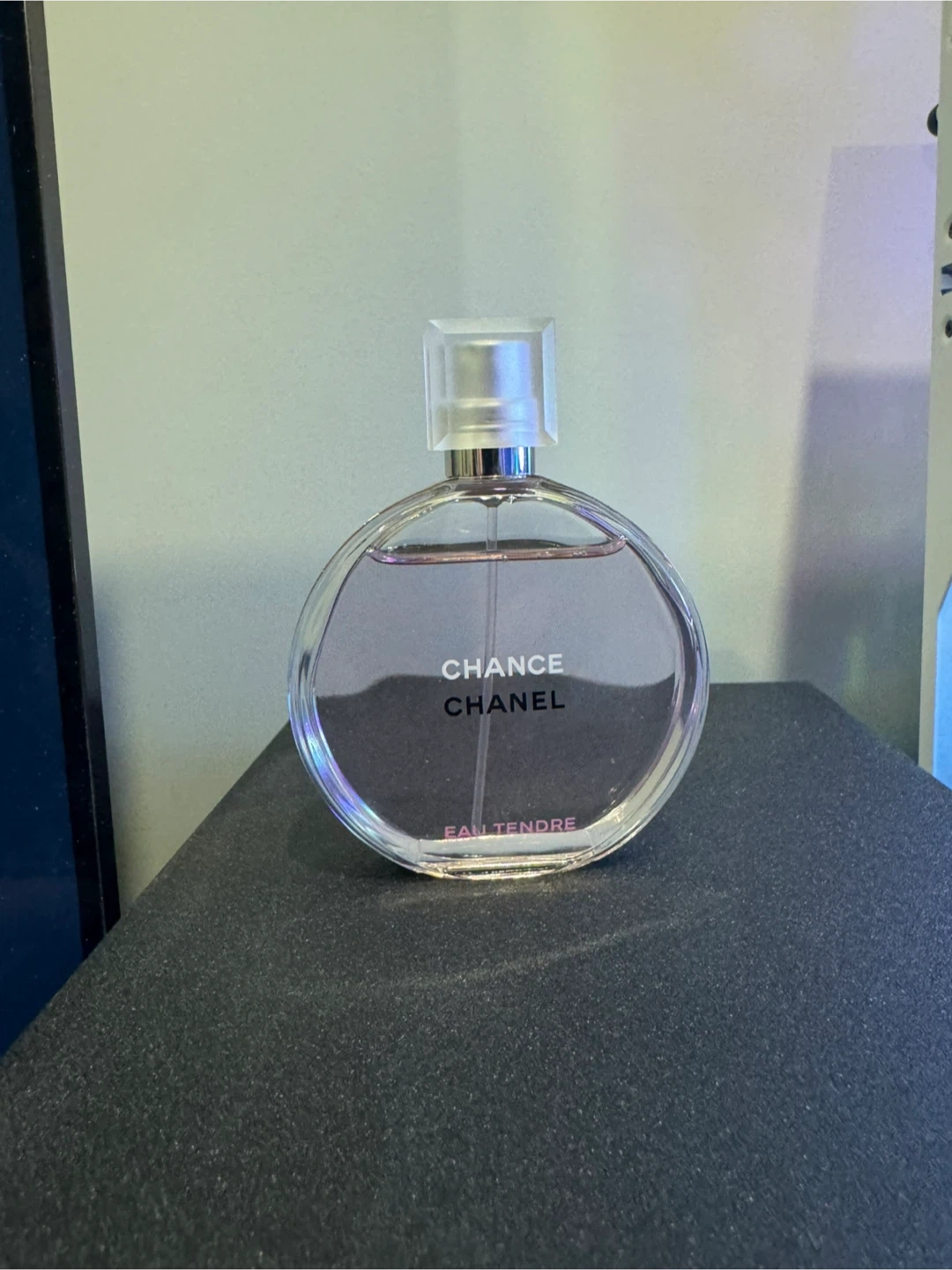 This is a bottle of Chanel Chance Eau Tendre perfume. The bottle is round with a clear cap. It's a well-loved fragrance.