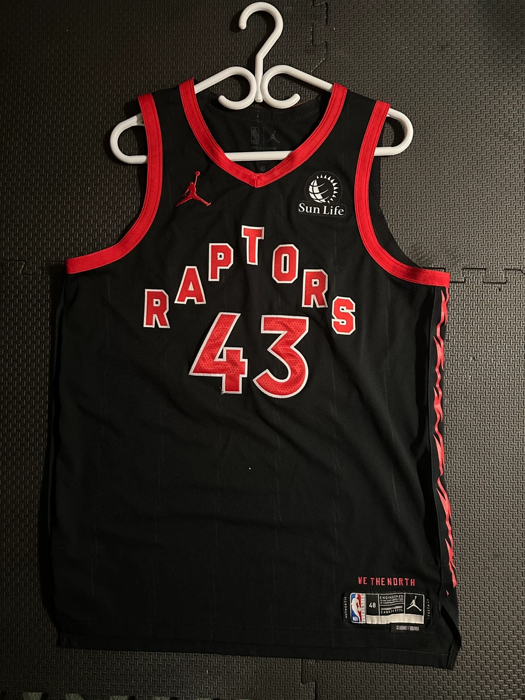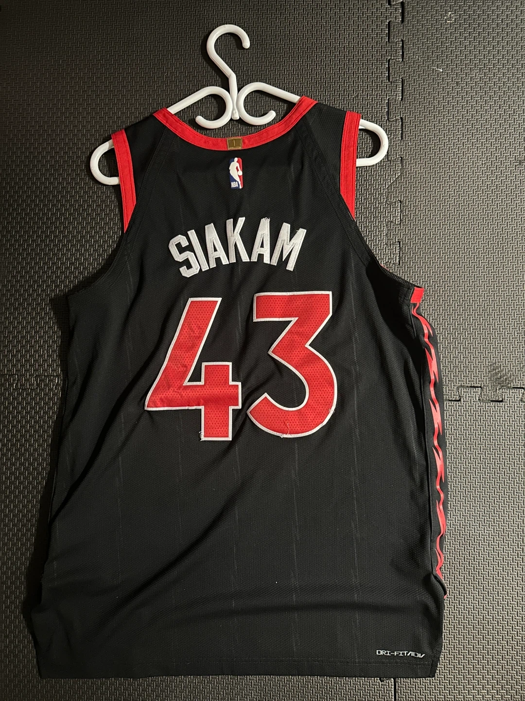 This is a Nike Toronto Raptors basketball jersey. It features the name "SIAKAM" and number "43" on the back. The jersey is made with Dri-FIT technology for moisture-wicking comfort. It's a size 48.(large)