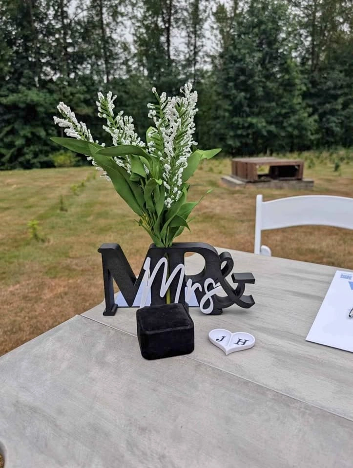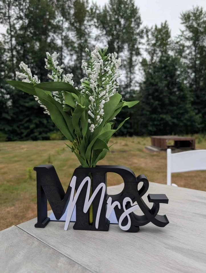 Brand new Mr & Mrs Wedding table signs. Available in any color combo! They have a hole that can hold some fake flowers, pen, etc. Fully 3D printed and made to last! Measuring 9.8" x 4.5". $15 each, including 1x fake flower Boquete as shown.