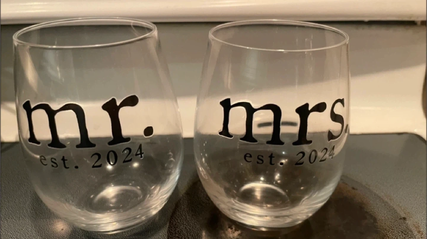 506Selling a cute pair of wine glasses, one says "Mr." and the other says "Mrs." They both say "est. 2024" below the titles, perfect for a newly married couple! Lobby Pick Up!