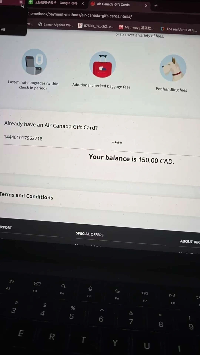 An Air Canada $150 E-Gift Card is available. Use it for flights or other Air Canada services. Balance is 150.00 CAD.