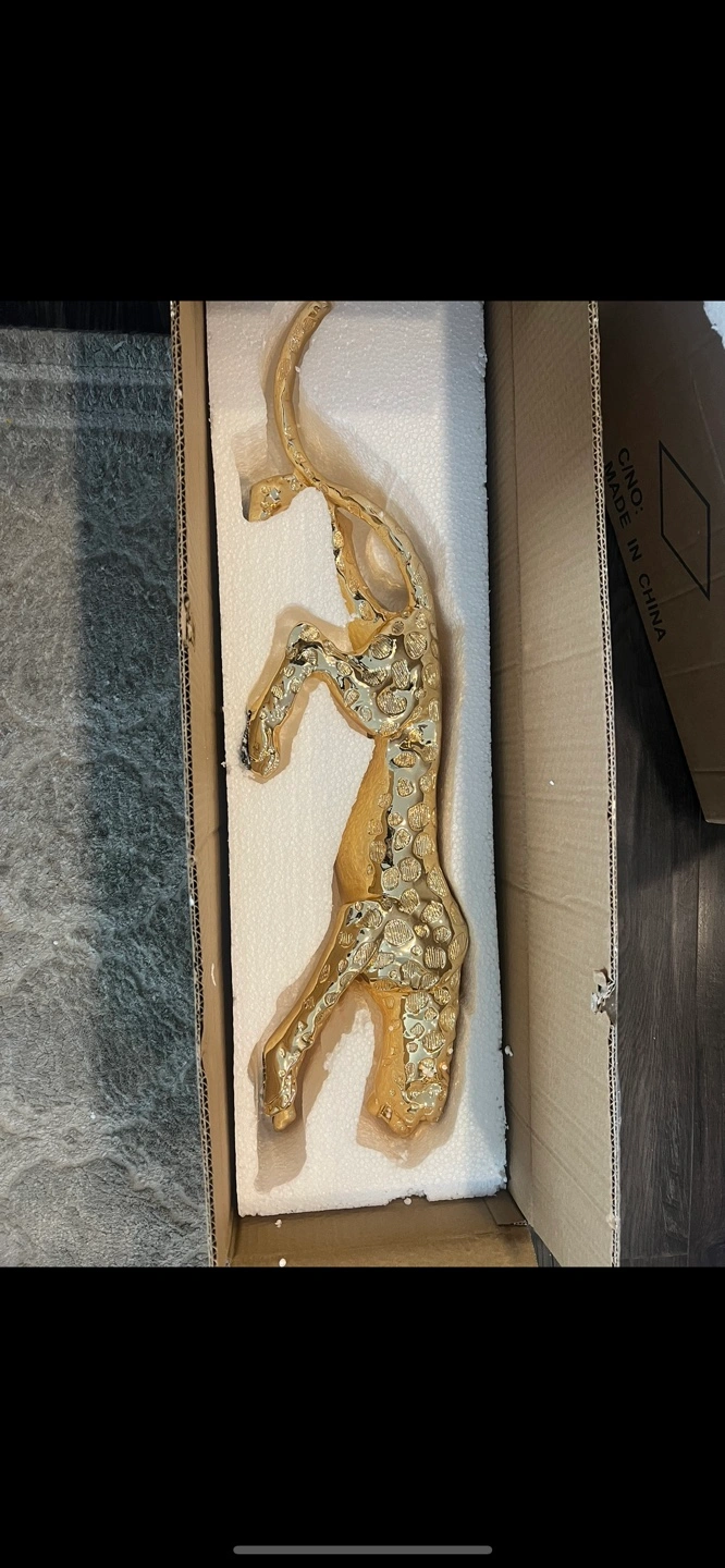 This striking gold leopard sculpture adds a touch of elegance to any space. Crafted from metal with a unique, textured finish, it's a statement piece for your home decor. Includes original packaging for safe transport.