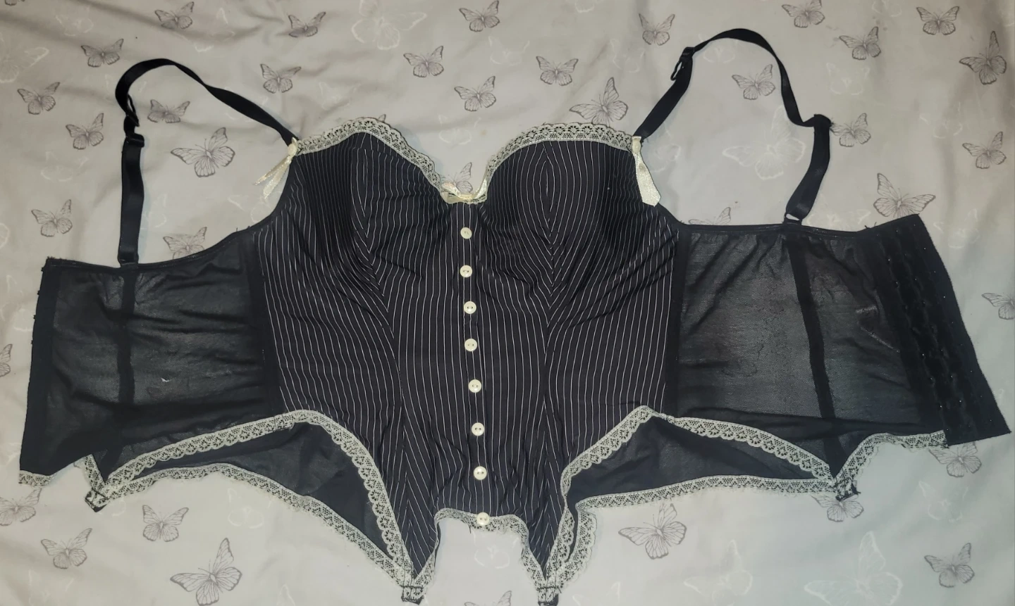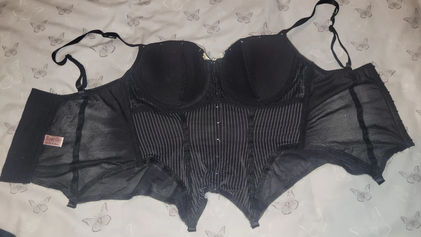 This black Roselle corset features pinstripe detailing and adjustable straps. It's made with a blend of fabric for comfort and support.