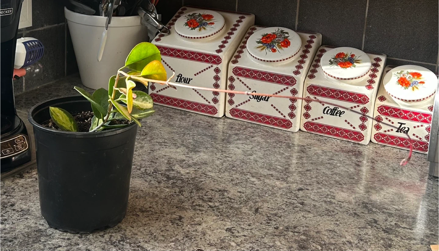 It's a Hoya Carnosa plant in a black plastic pot. It features variegated green and yellow leaves. This plant is great for adding a touch of greenery to your home!