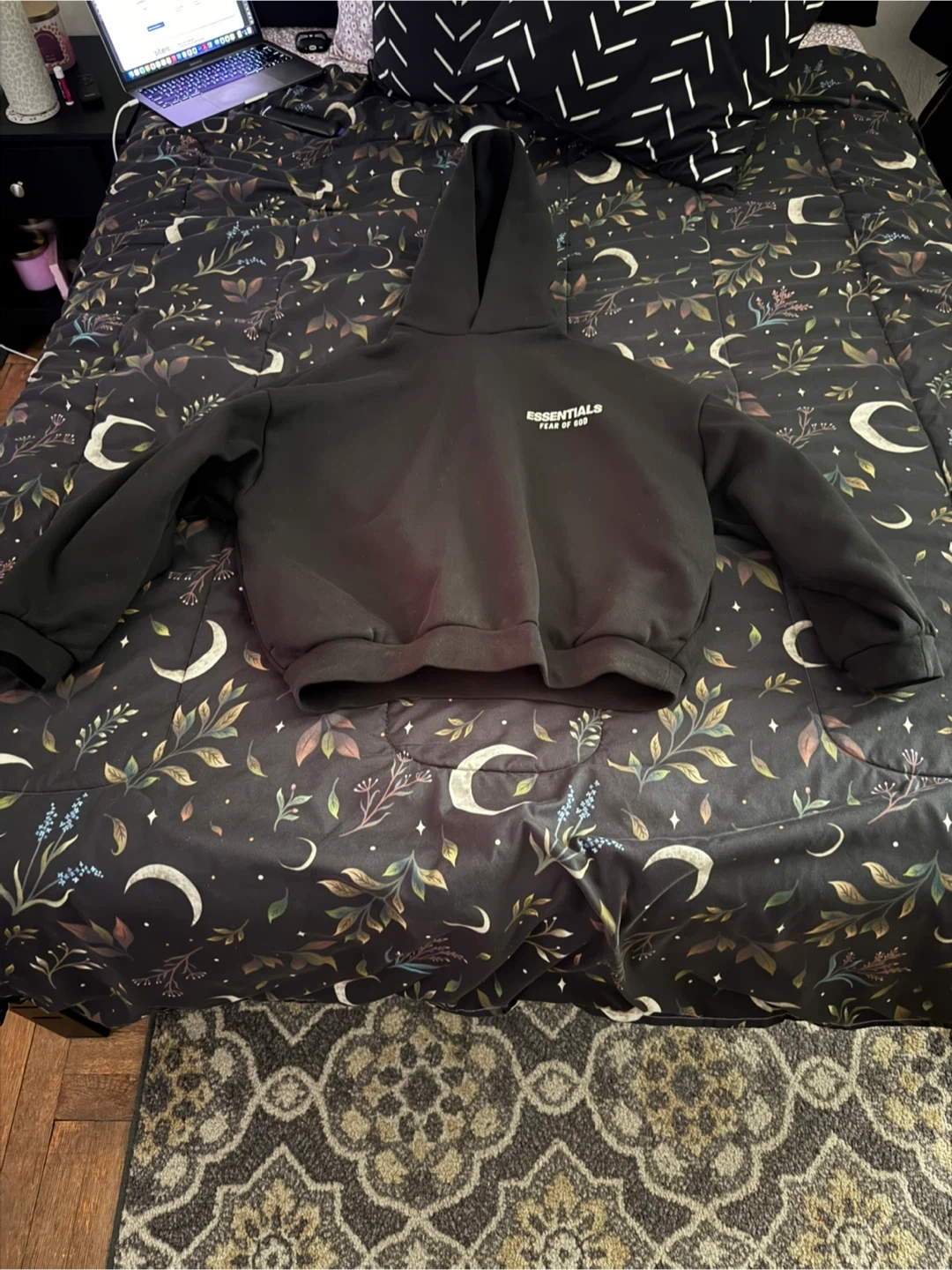 Black Fear of God Essentials hoodie. This comfortable hoodie features the brand's logo on the back and chest. It's made from soft material for everyday wear.