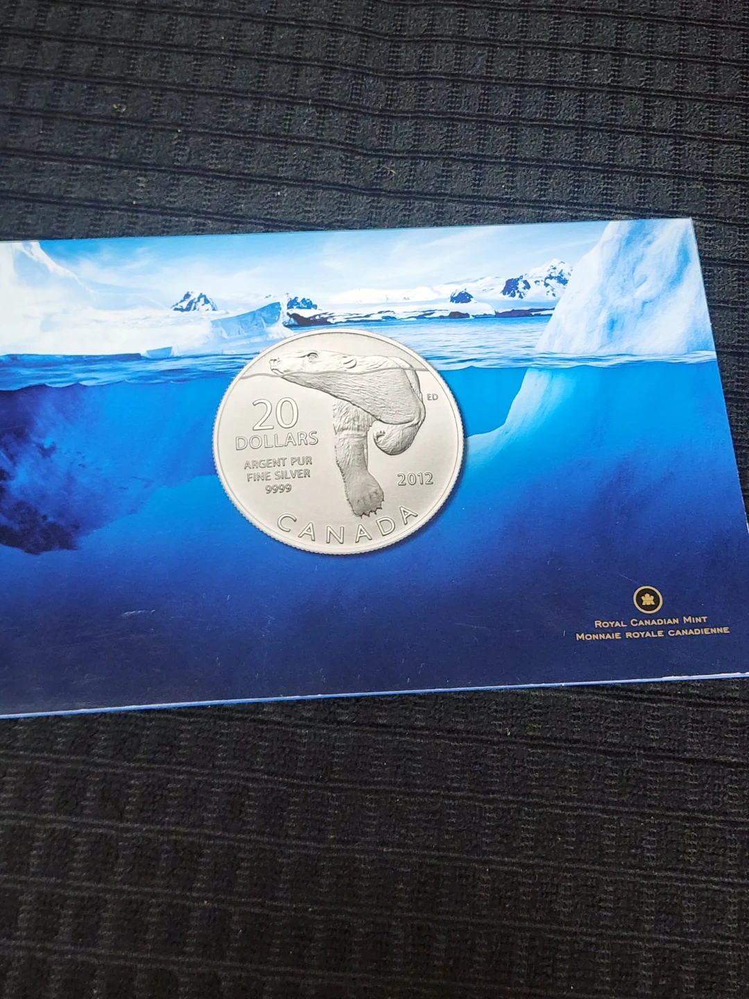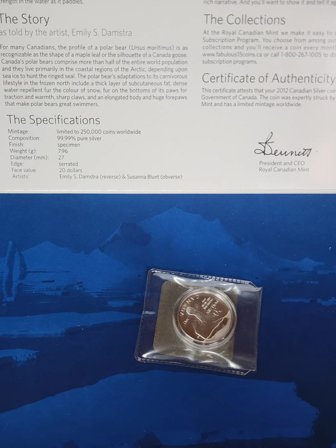 Selling a 2012 Canadian silver coin featuring a polar bear! It's made of 99.99% pure silver and weighs 7.96 grams. The diameter is 27 mm, and the face value is 20 dollars. A great addition to any collection