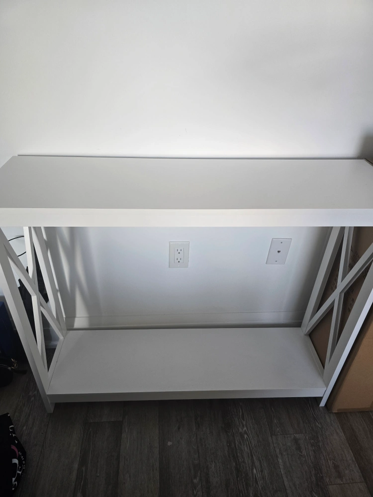 A white console table with a single shelf. It is made of wood and features a simple, modern design. Some small scratches on top as shown in picture.