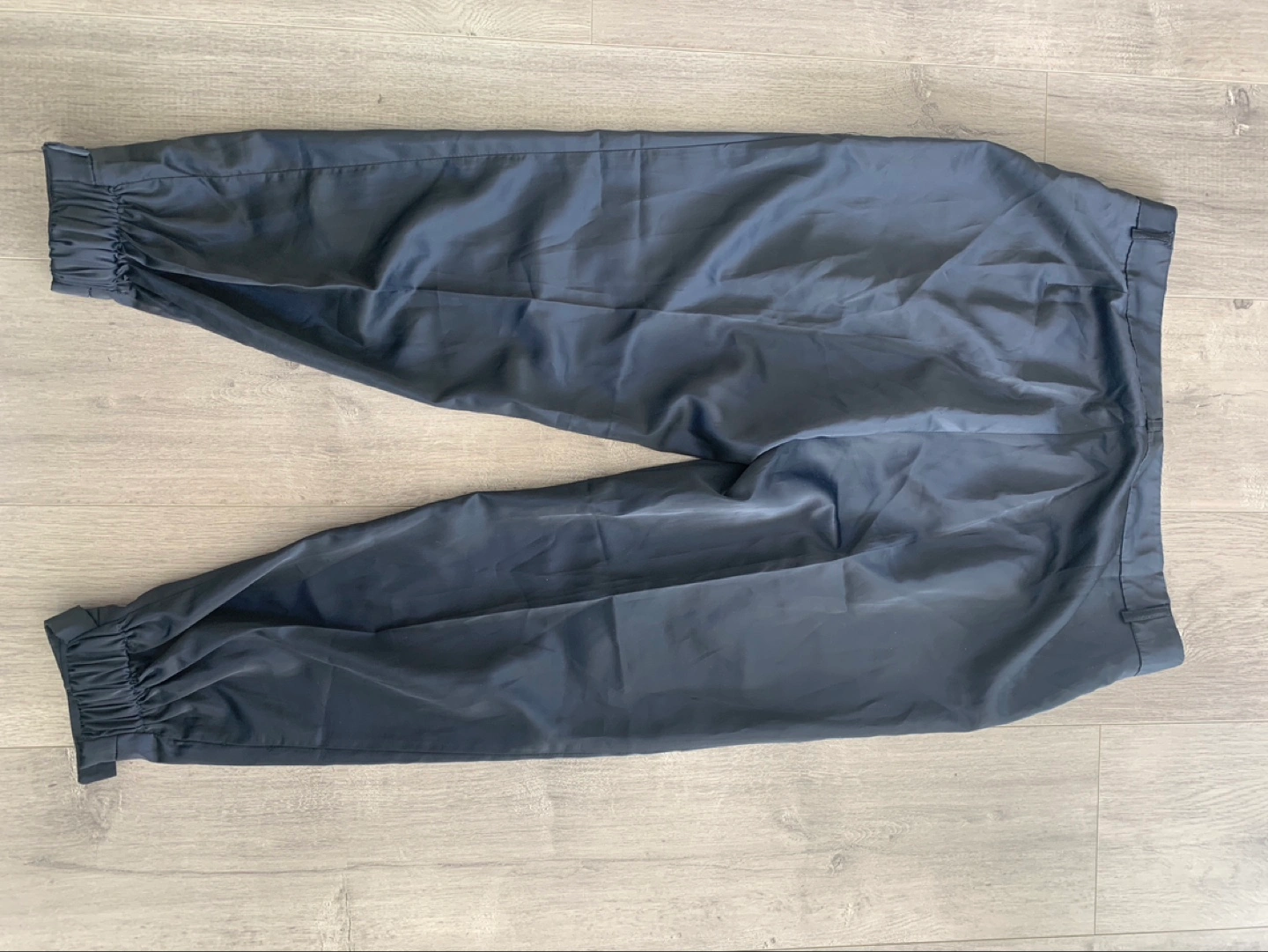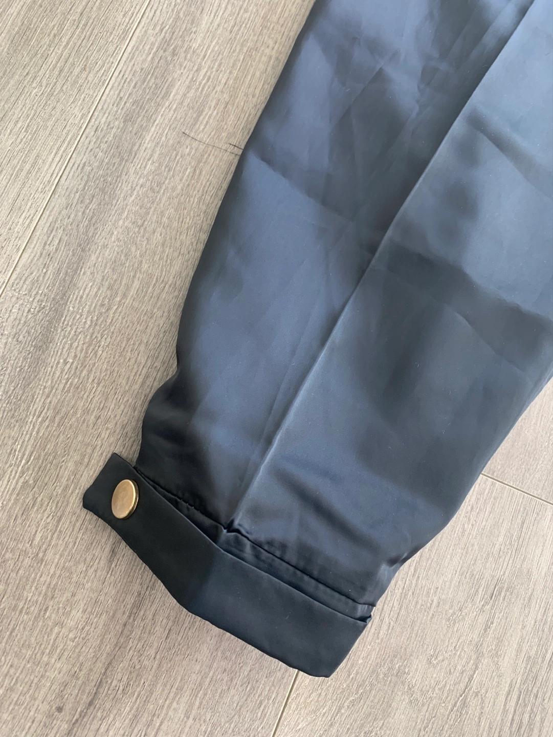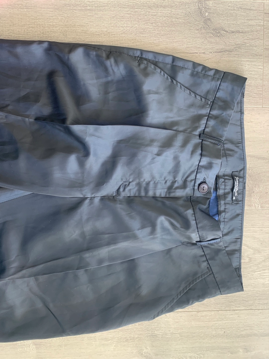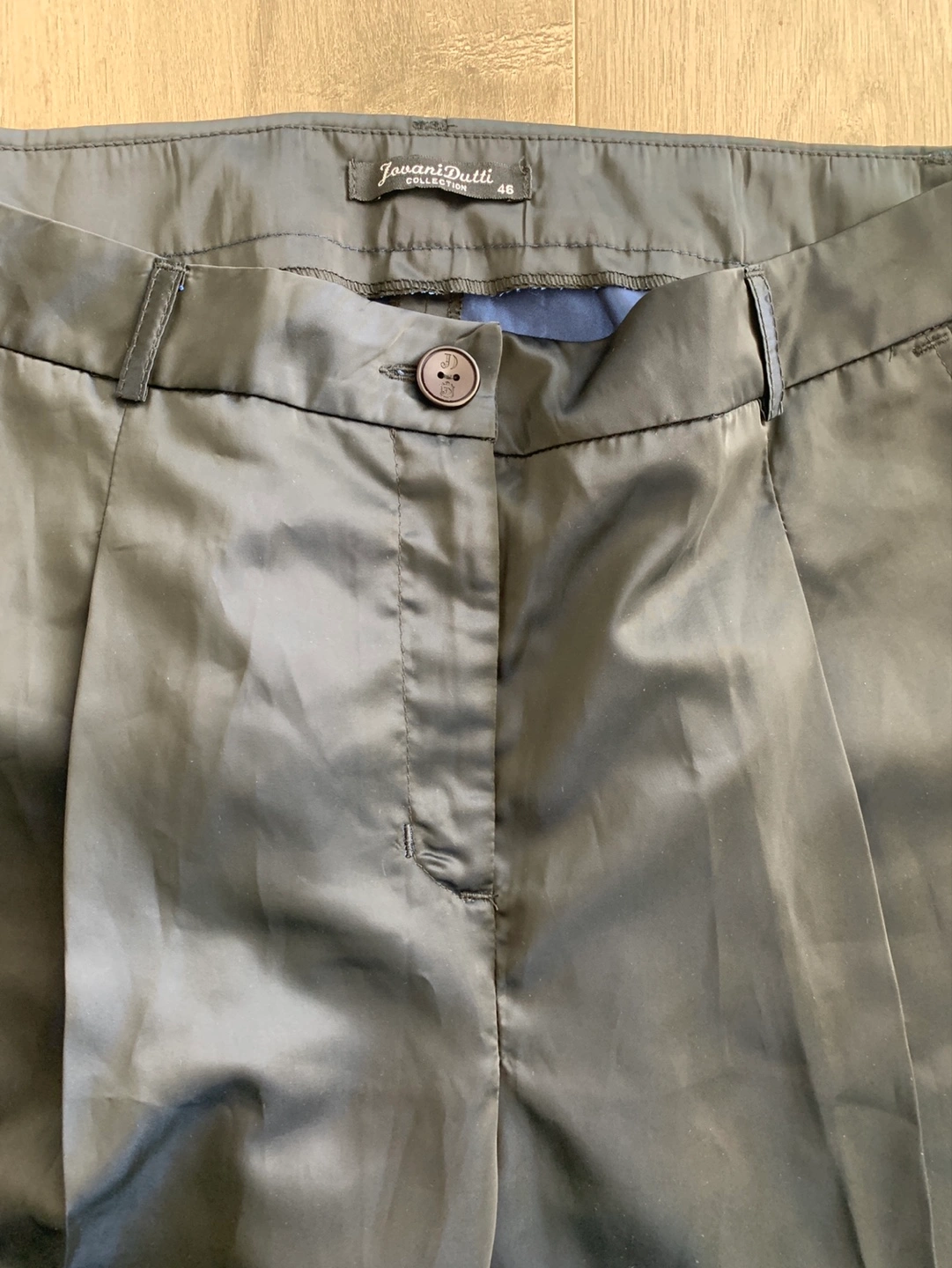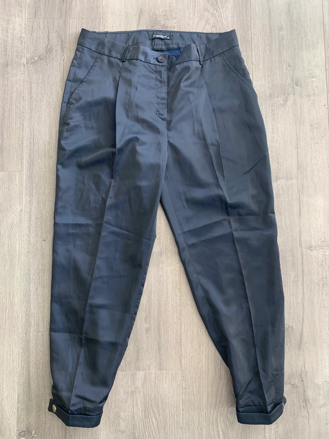Women's dark blue: purple trousers. Size 46. Pleated front. Button and zip closure. Cuffed hems. Satin sheen.