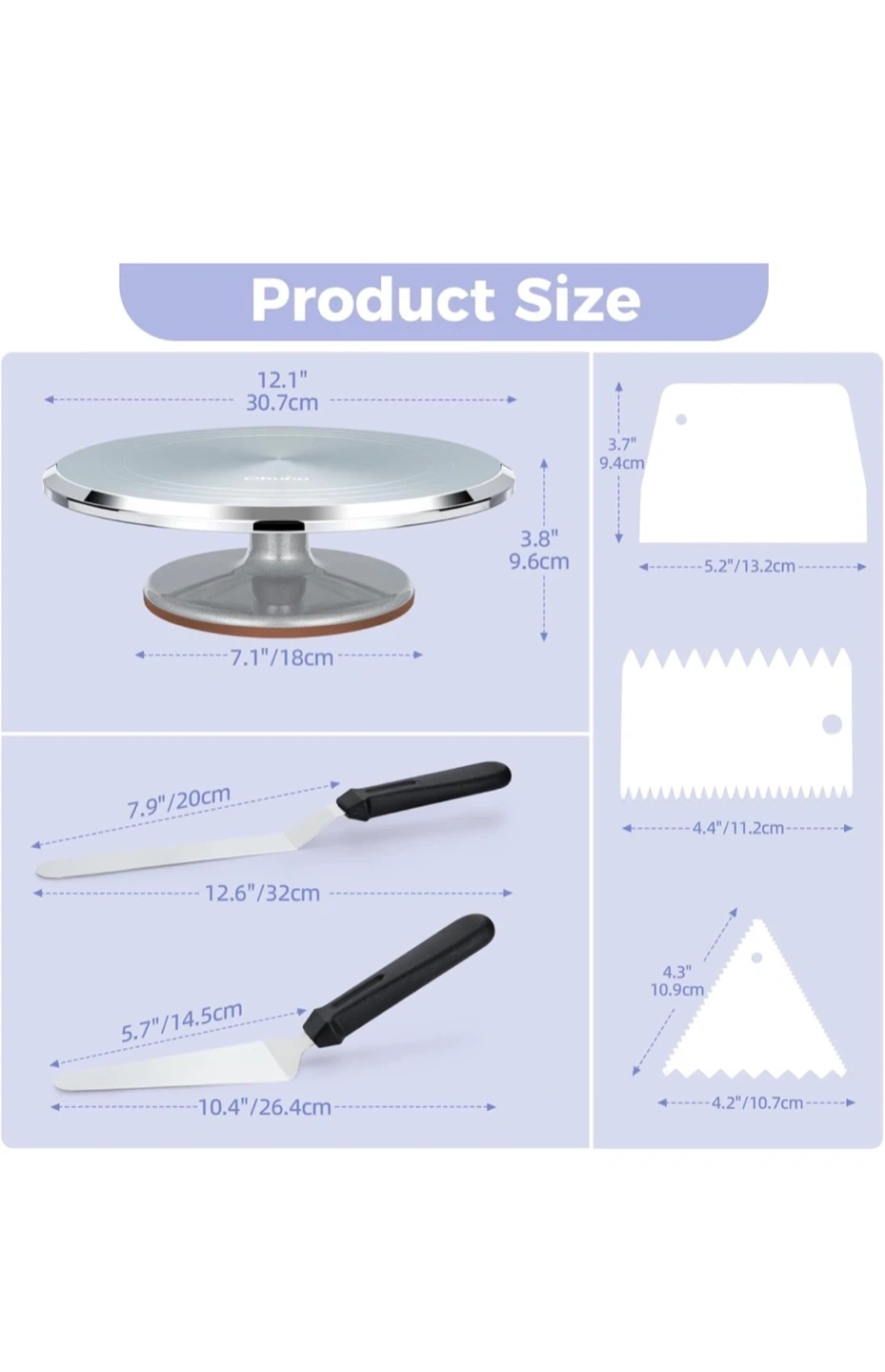 This cake decorating set includes a rotating turntable and three icing spatulas. The turntable is 12.1" in diameter and 3.7" high. Spatulas measure 7.9" and 5.7" long. Perfect for smoothing frosting and creating beautiful cakes!