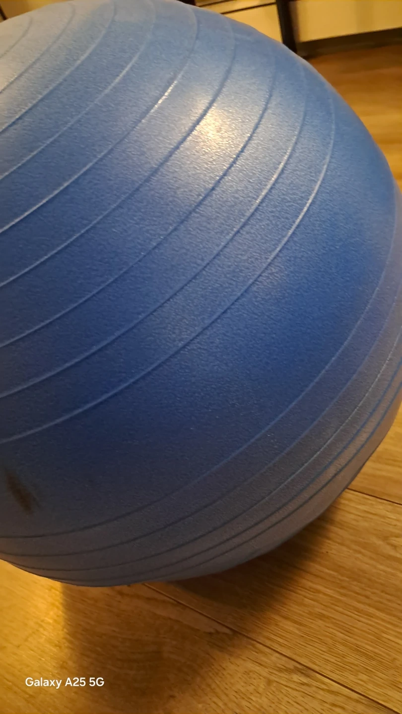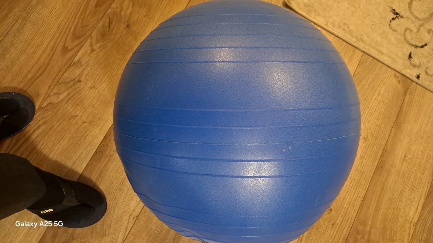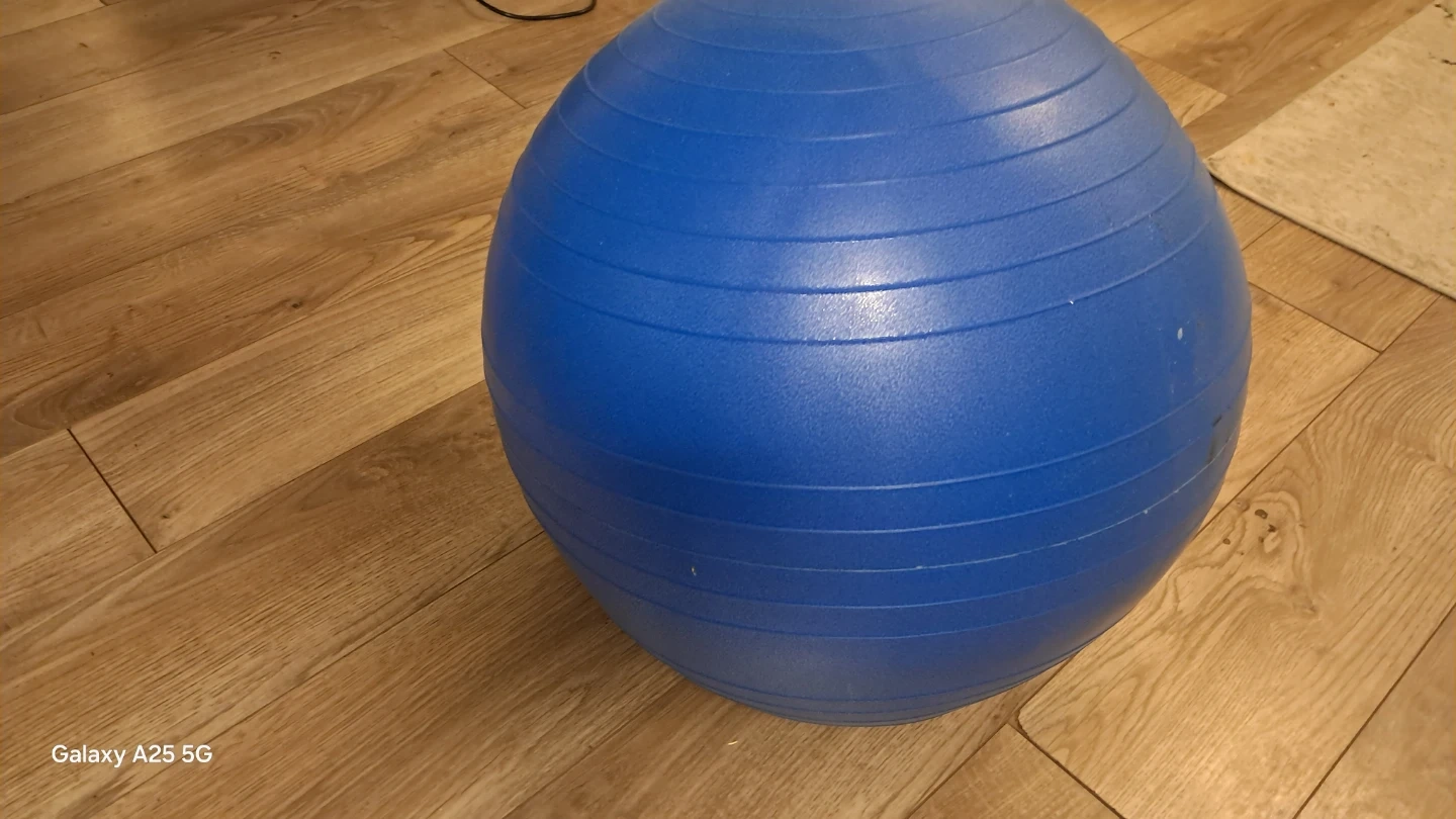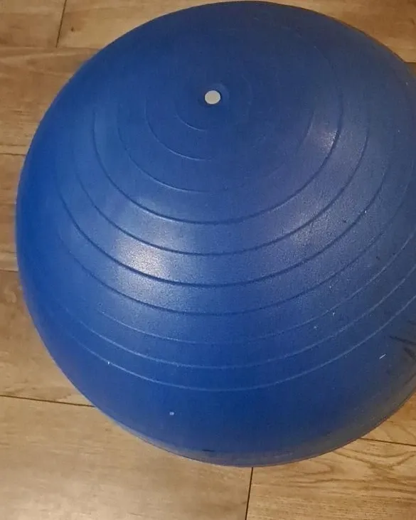 A blue exercise ball for workouts. It's made of durable material. This ball's great for core strengthening and balance exercises! Barely used like new I have also delivered it a bit vharges depends upon distance