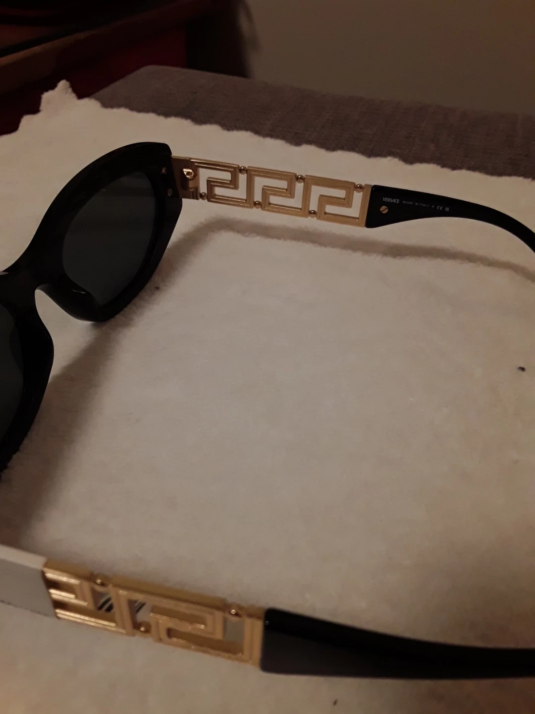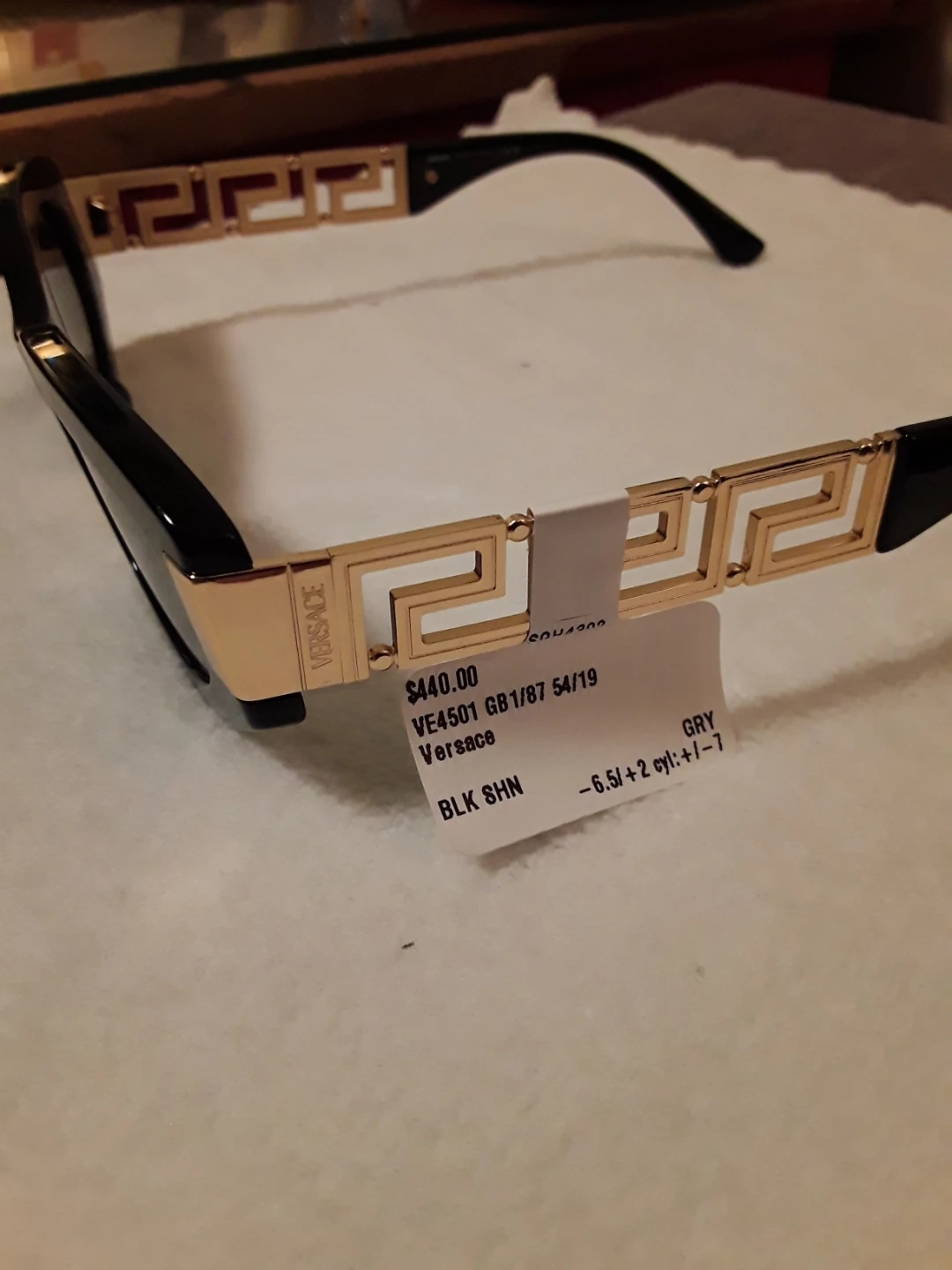 These are Versace VE4501 sunglasses in black with gold detailing. They have a 54/19 lens size and grey lenses. Made in Italy.