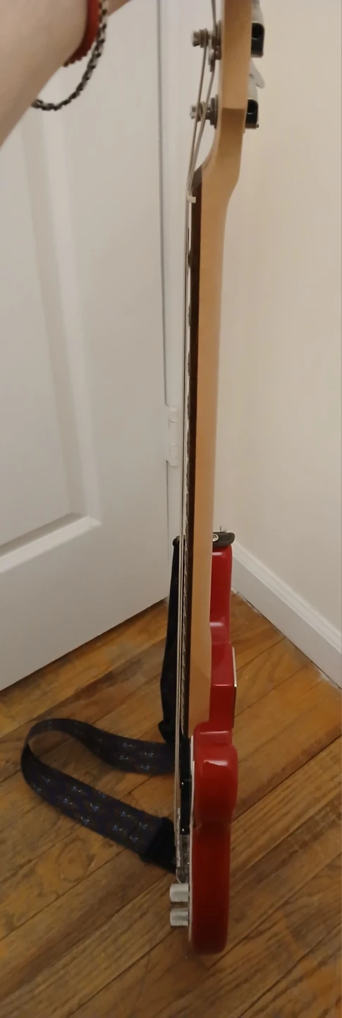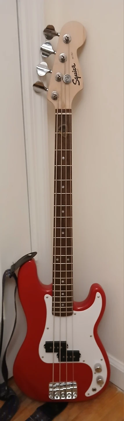 A Squier mini P-bass in Dakota Red, lightly used, by no means abused, in excellent condition -- like new.