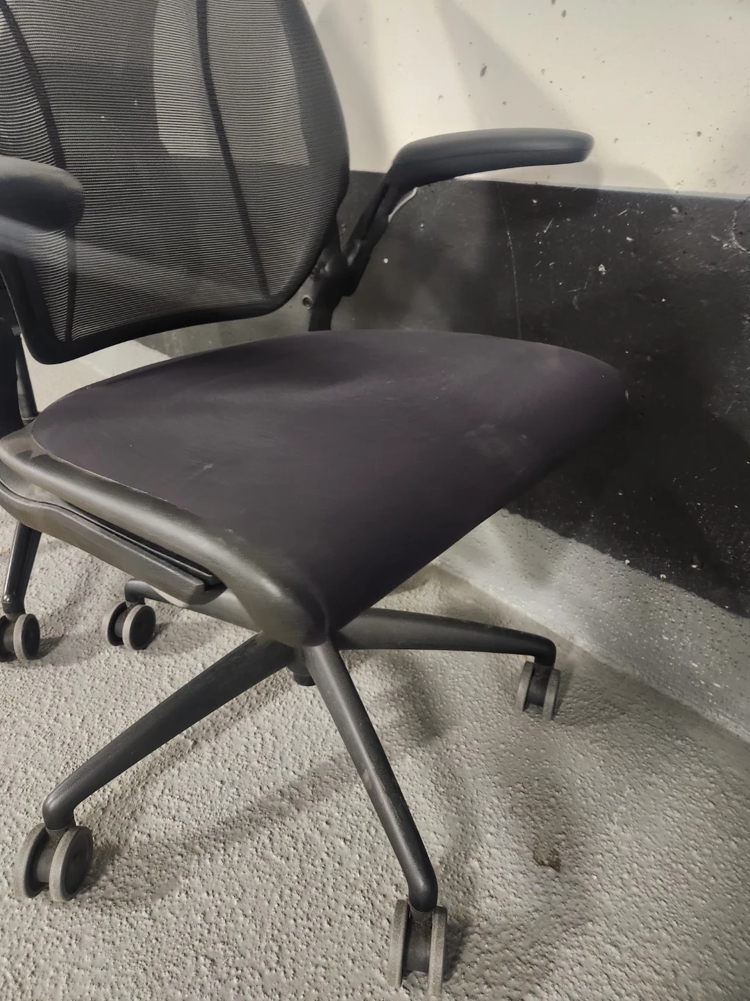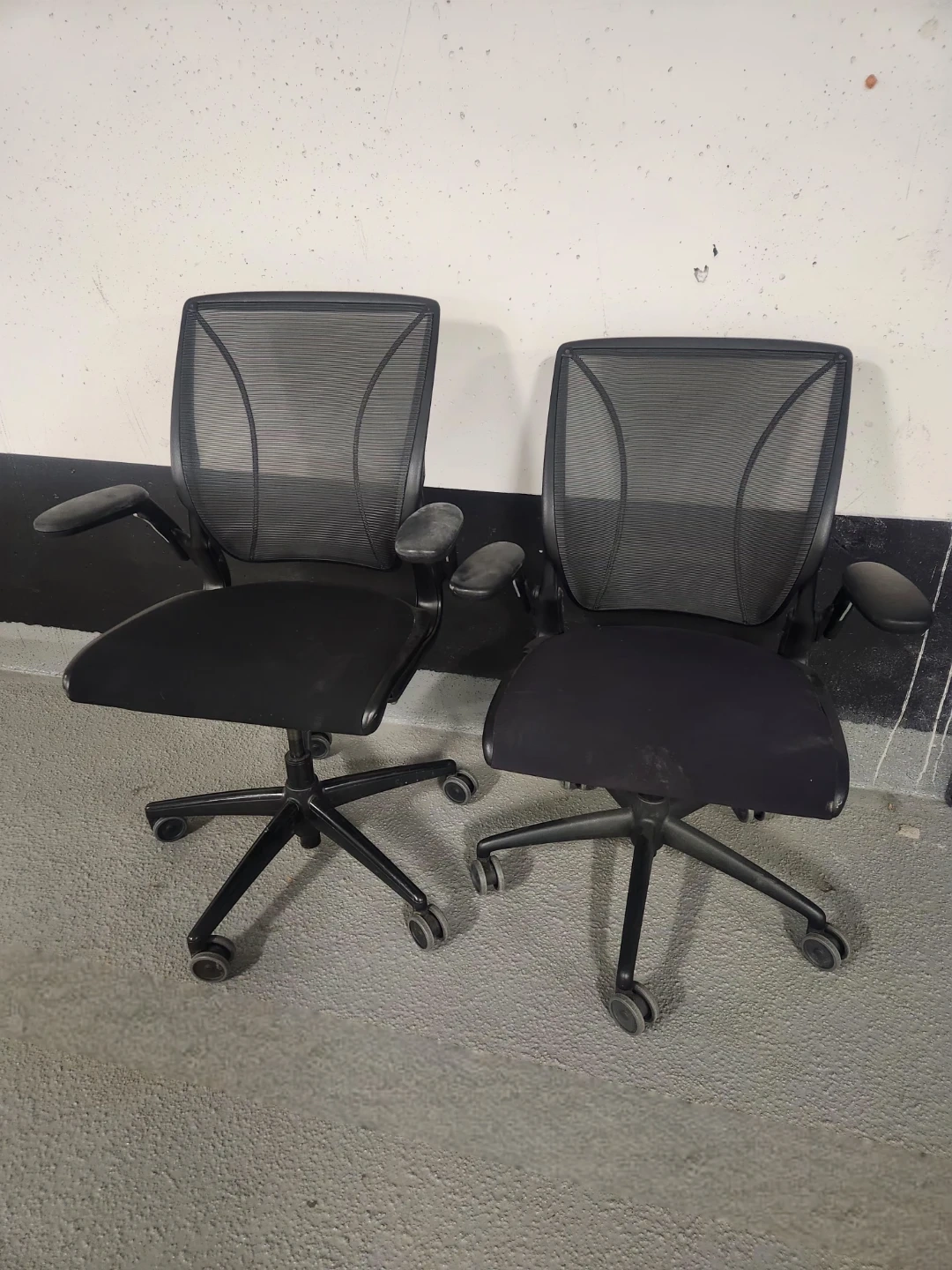 Two black mesh back ergonomic office chairs. These chairs offer adjustable armrests and a comfortable seat. They're great for any home or office. Retails for $1800 new, asking only $350 each or take both for $600.