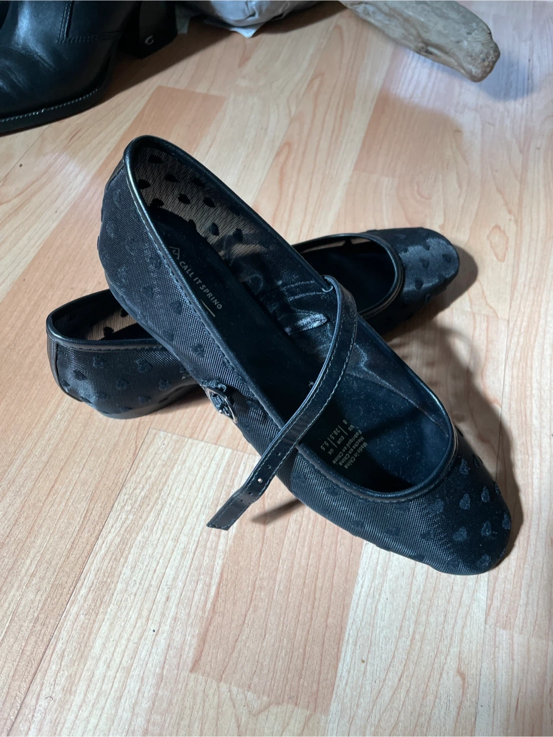 Black mesh flats with a subtle heart pattern. Features a classic Mary Jane strap with buckle closure. Never worn.