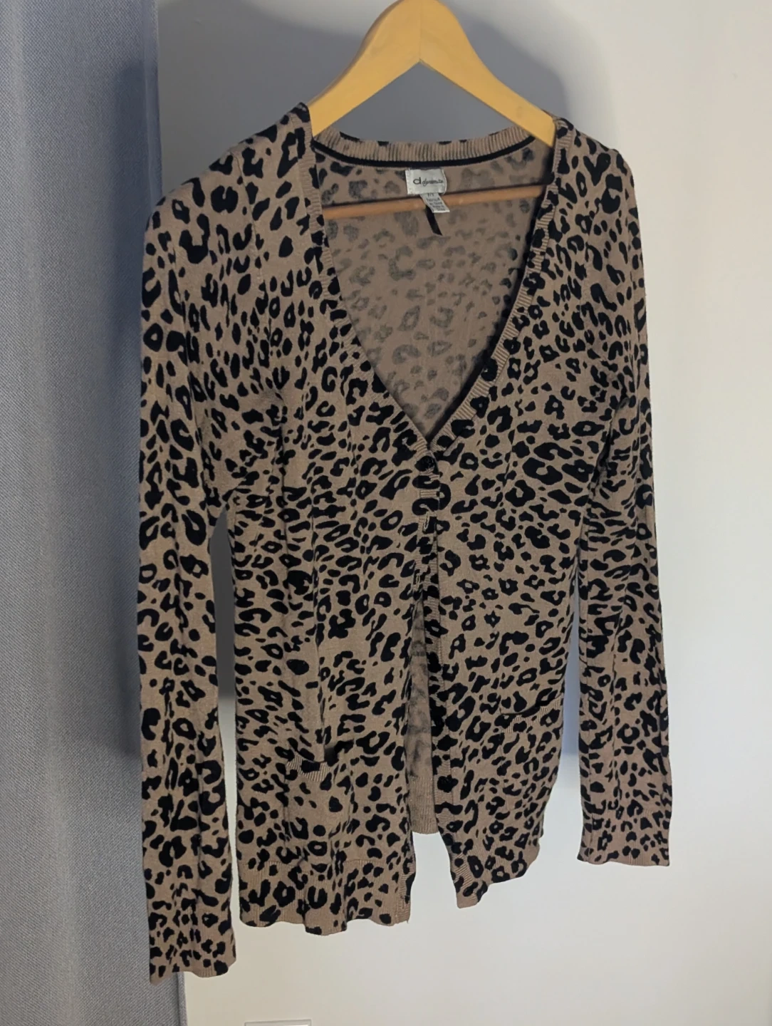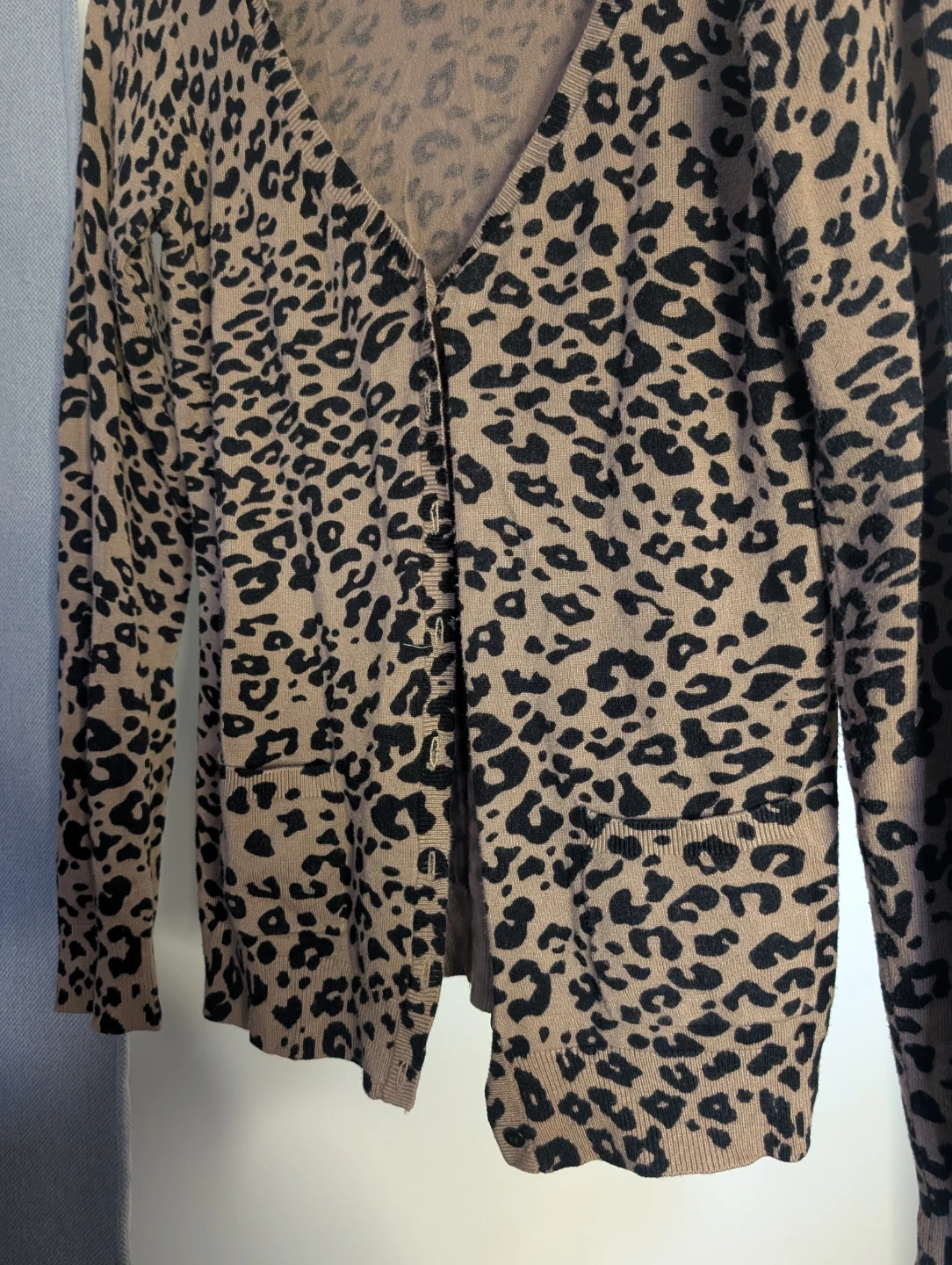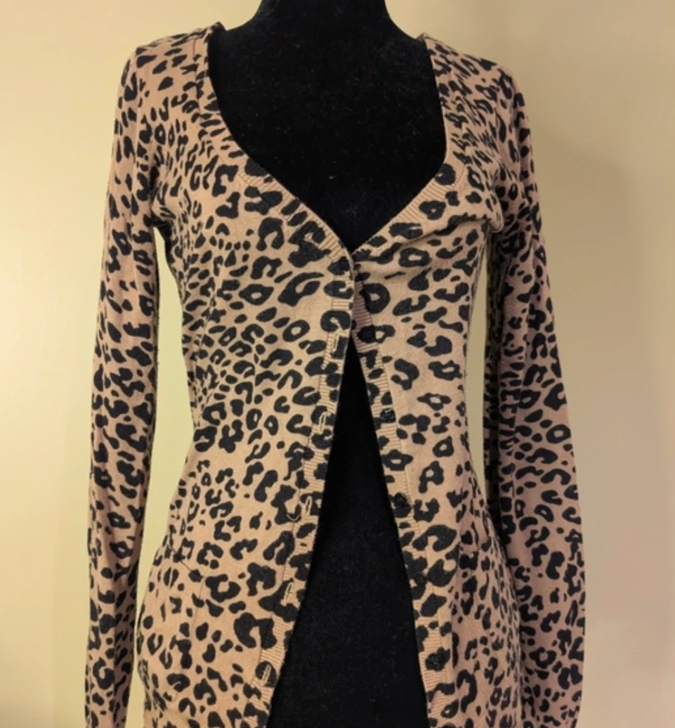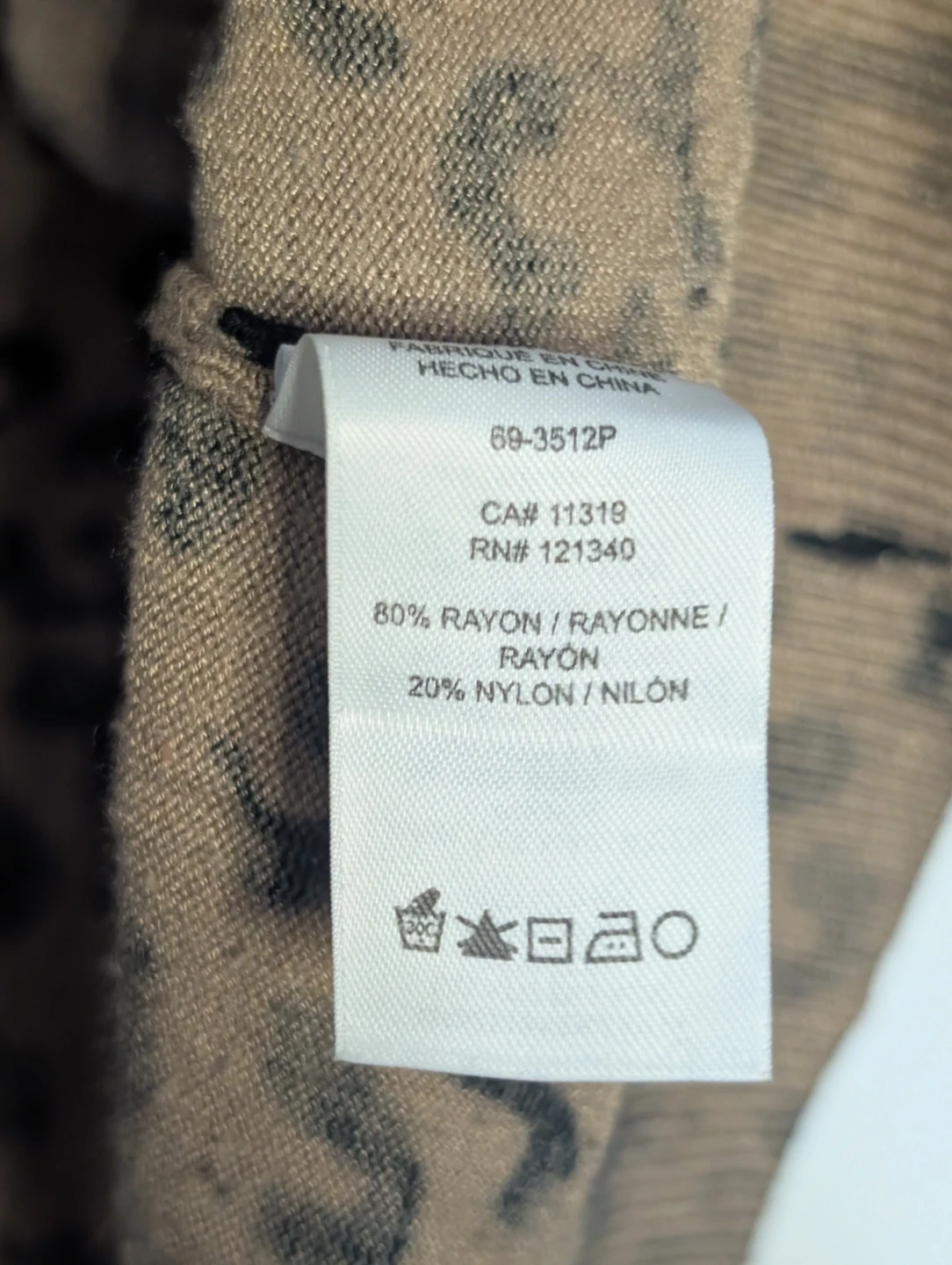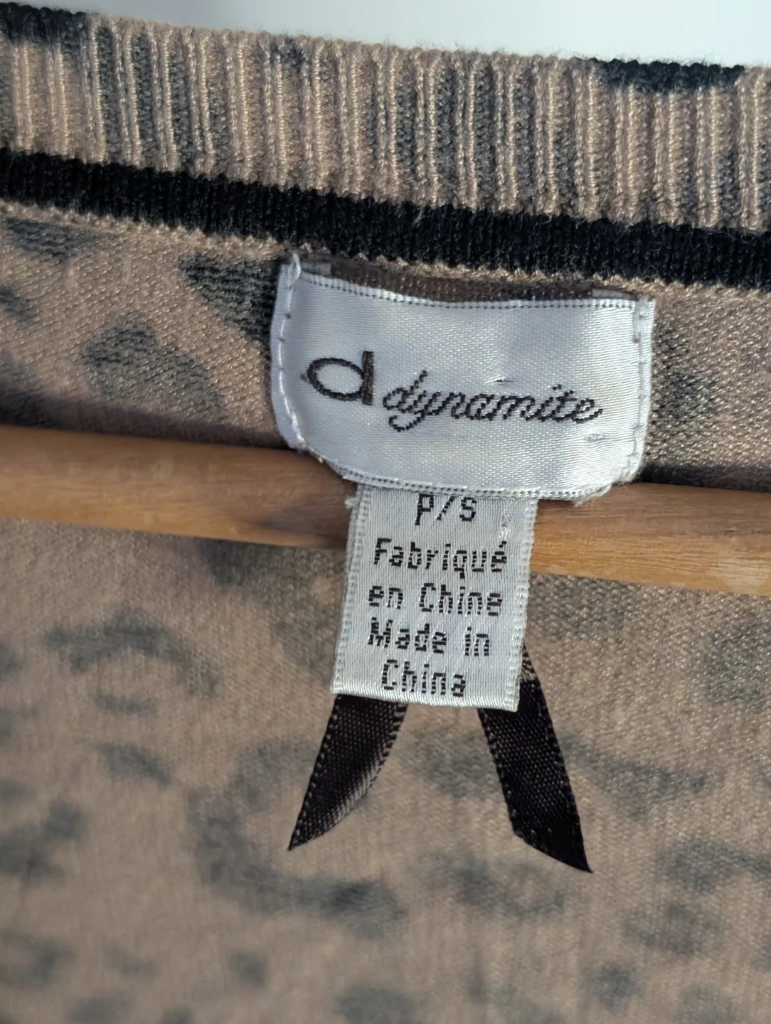 This Dynamite cardigan features a classic leopard print. It's made with 80% rayon and 20% nylon. This is a P/S size.