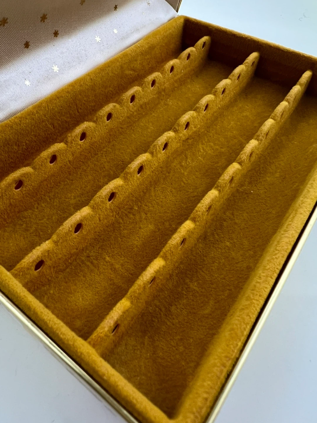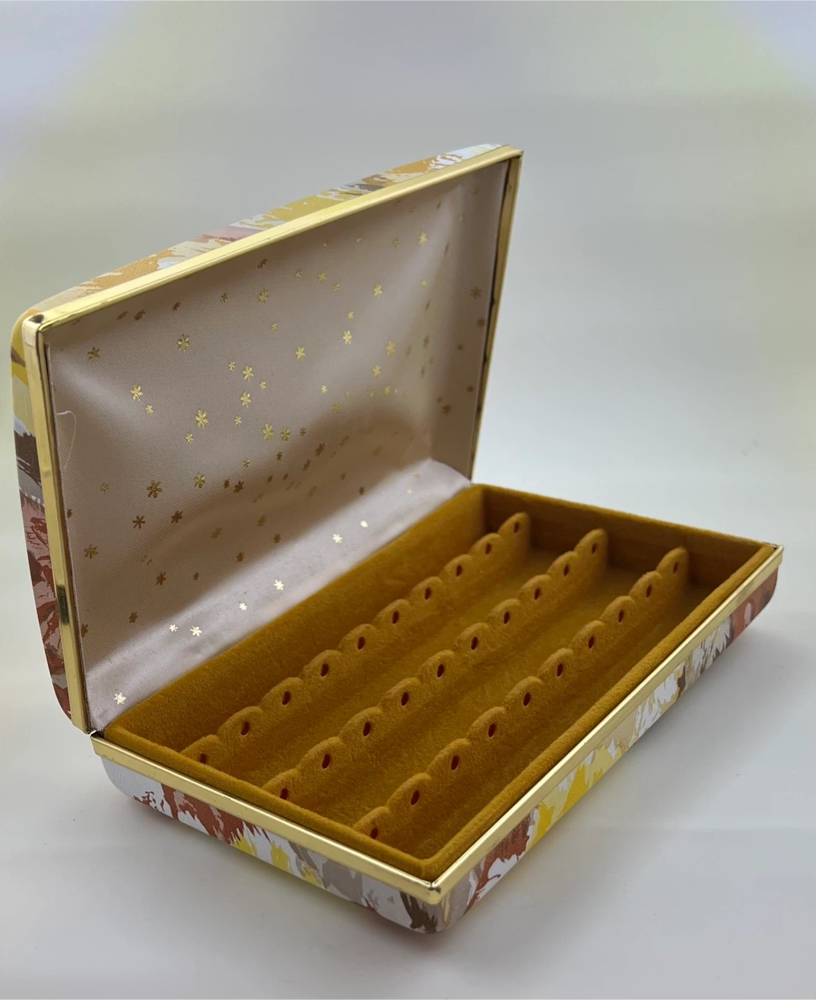 The interior is lined with a mustard-yellow felt material and features multiple notched rows specifically designed to organize and protect earrings and jewelry during travel