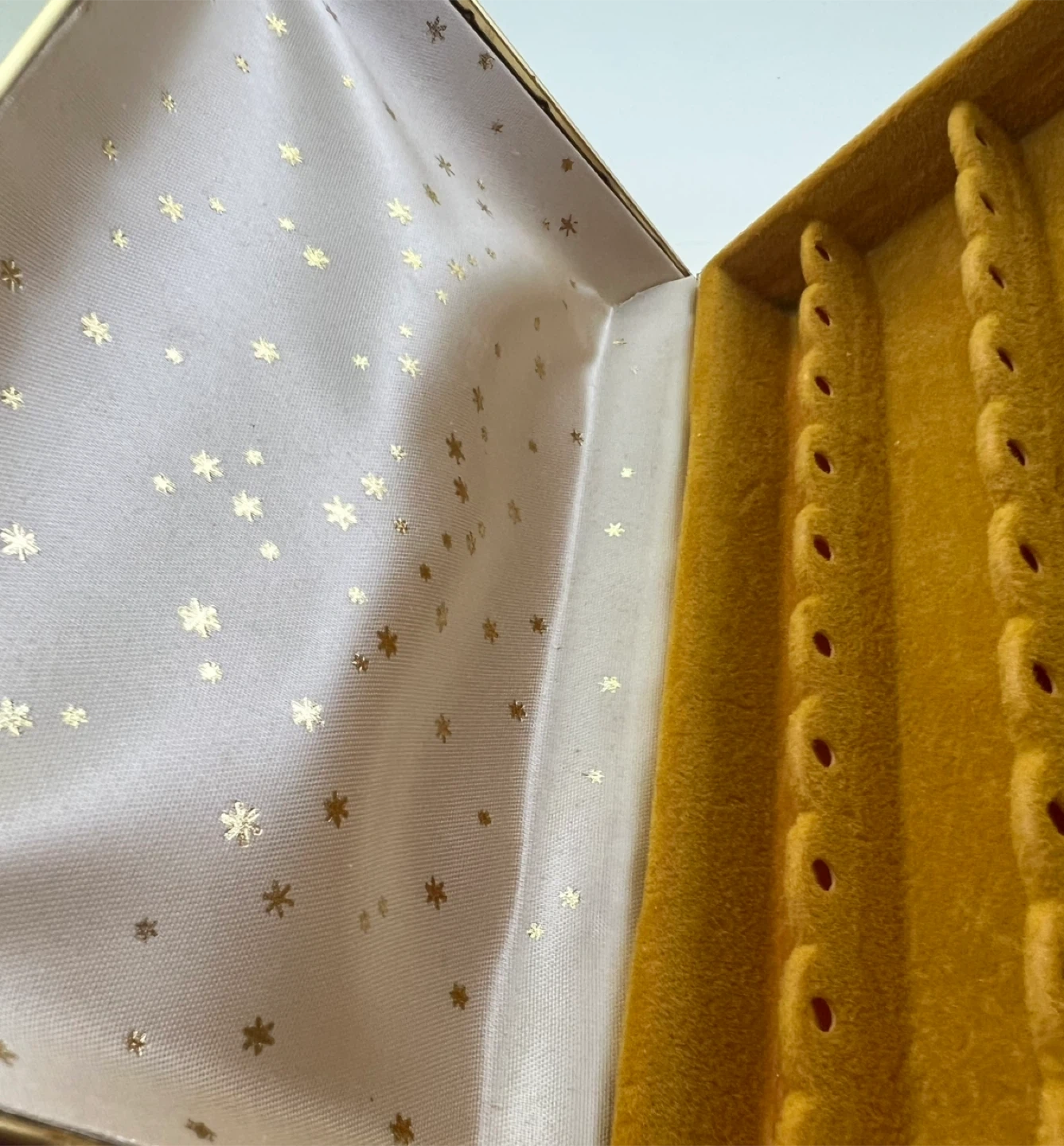 The inner lid is finished with a cream satin lining accented by metallic gold stars