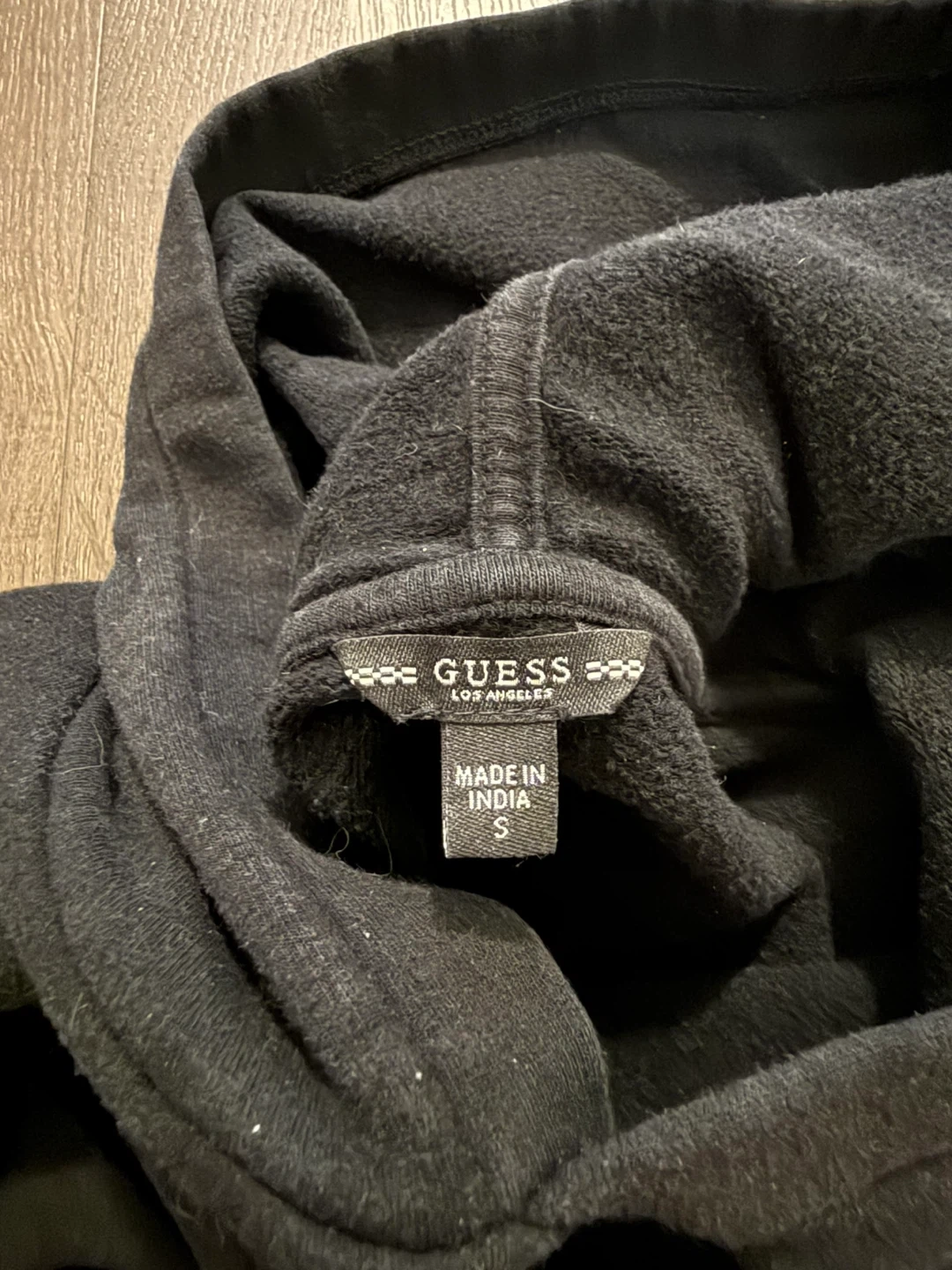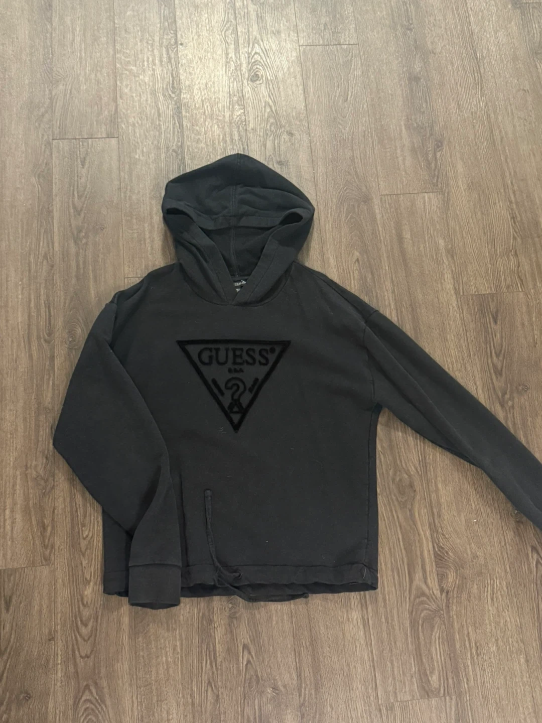 This is a black Guess hoodie with the iconic triangle logo. It's made in India and is a size small. It has a front pouch pocket and a drawstring hood.
