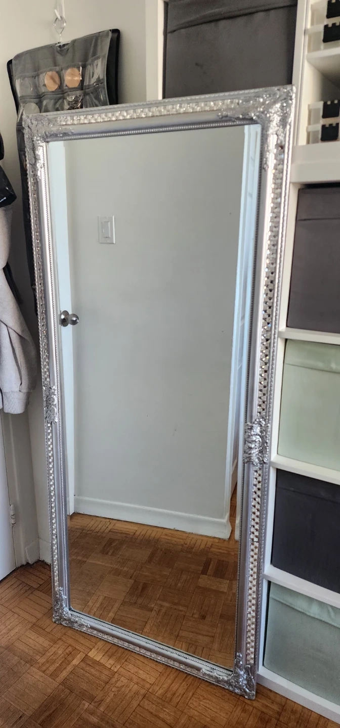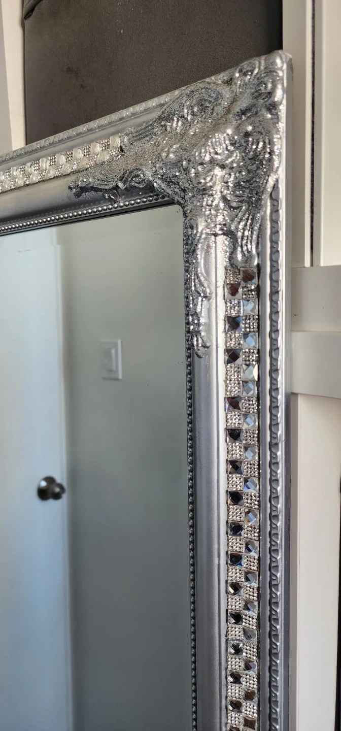 This is a large, ornate standing mirror with a silver-toned frame. The frame is detailed with decorative carvings and is further embellished with sparkling rhinestones. It's a statement piece that adds a touch of glamour to any room. 64x28cm