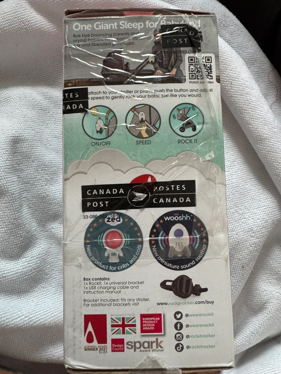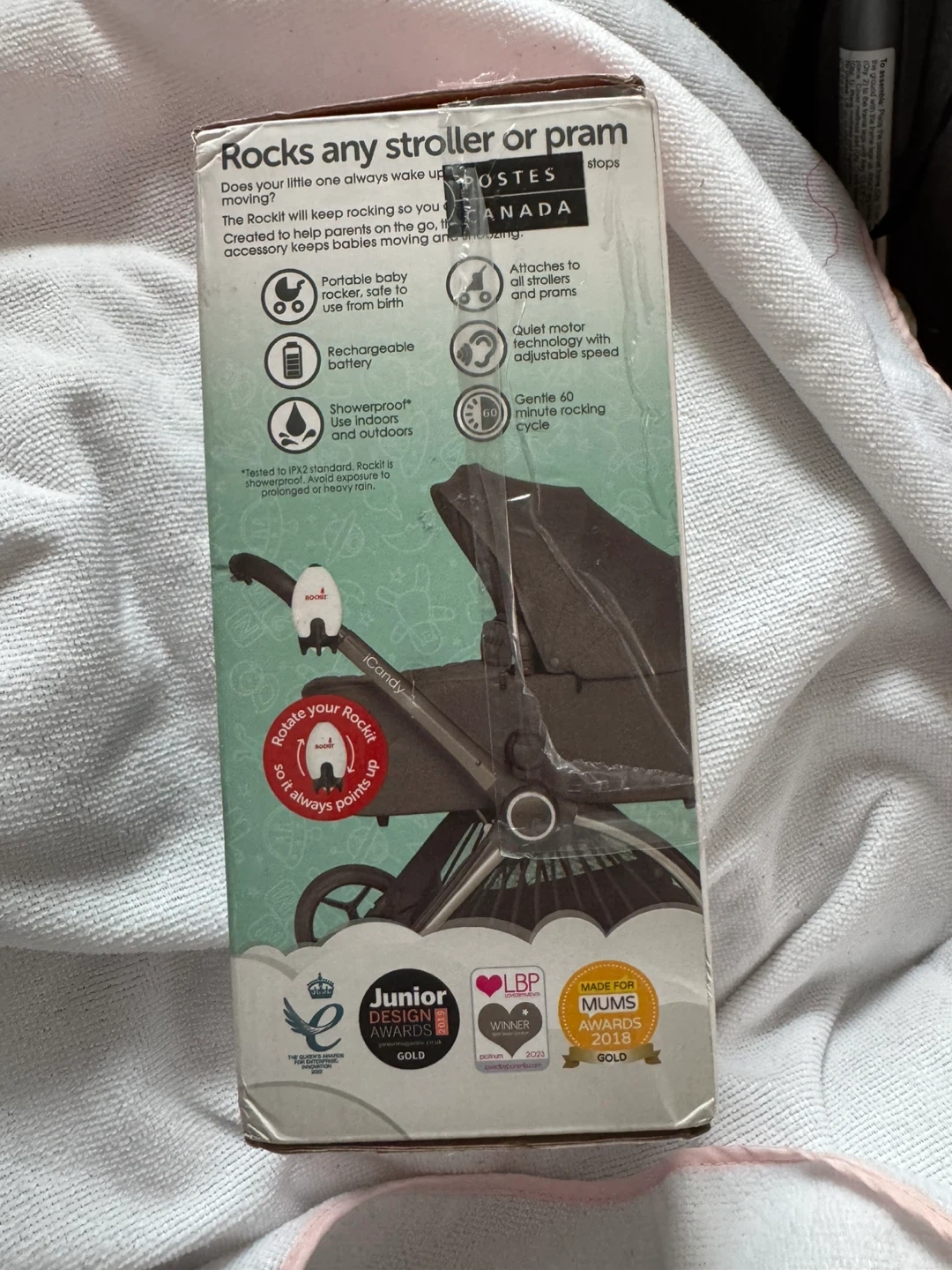 Selling a Rockit baby rocker! This handy gadget attaches to strollers or prams to gently rock your baby. It's showerproof and comes with a rechargeable battery. It also features adjustable speed and a quiet motor. The box includes the Rockit, a universal bracket, a USB charging cable, and instructions