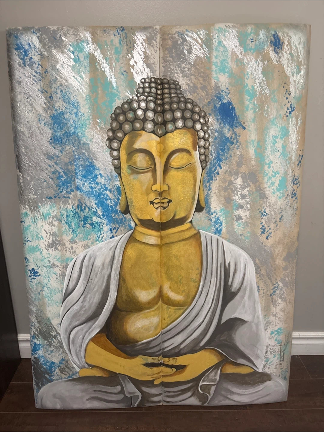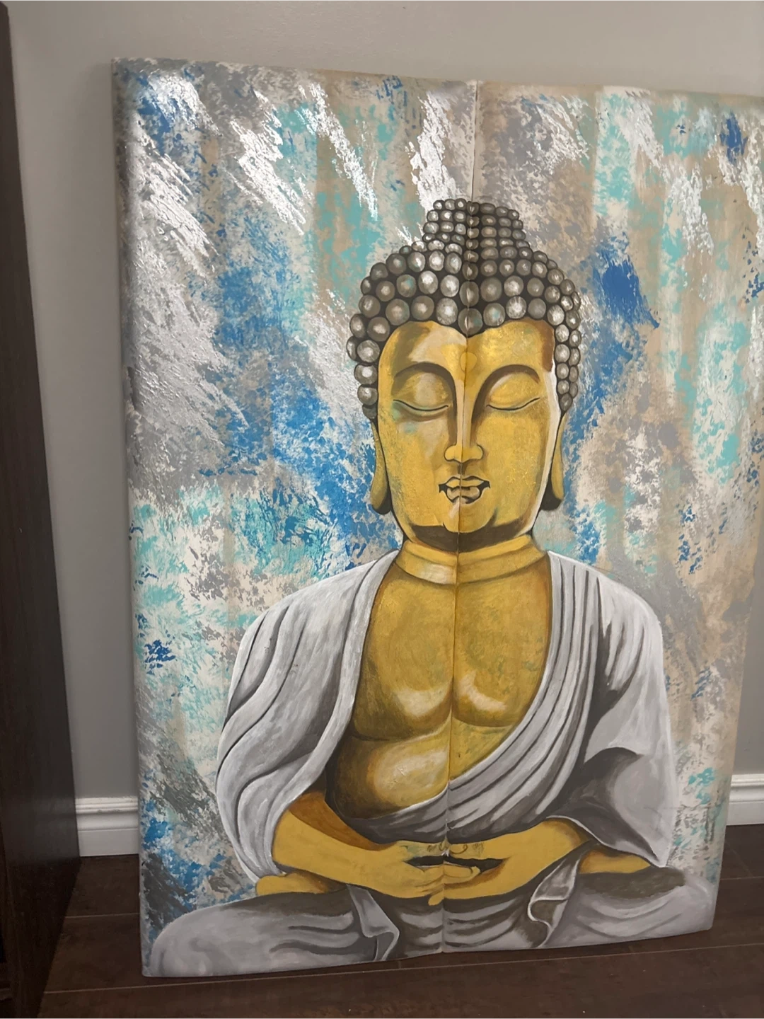 This is a beautiful, large canvas painting of a meditating Buddha. It's a two-panel piece with vibrant gold, grey, and blue tones. Adds a peaceful and artistic touch to any room!