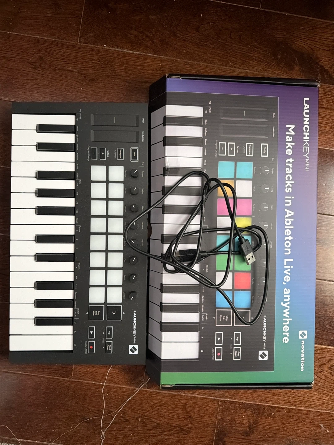 This is a Novation Launchkey Mini MIDI controller keyboard. It connects via USB and includes a cable. This compact device is great for making music on the go.