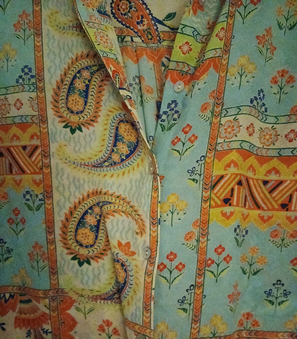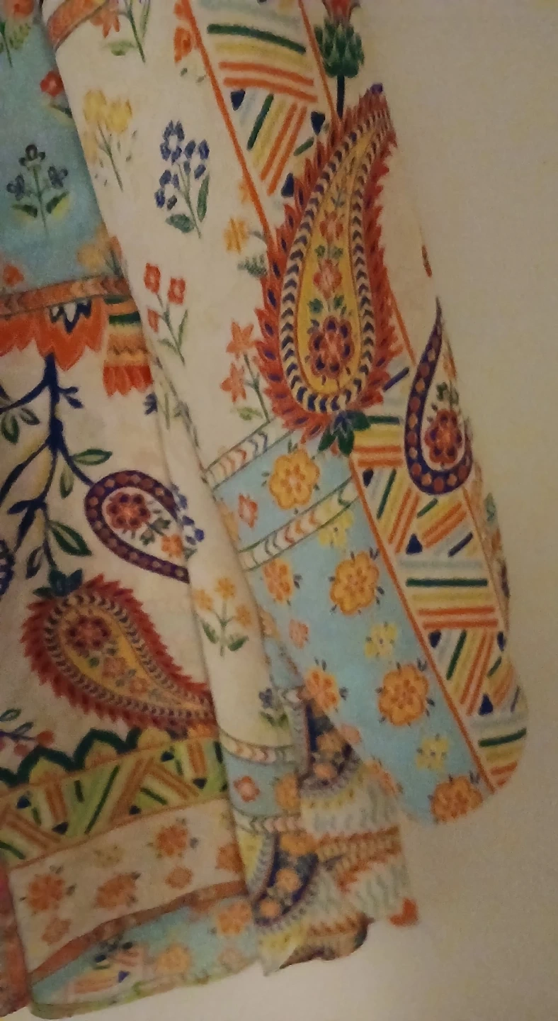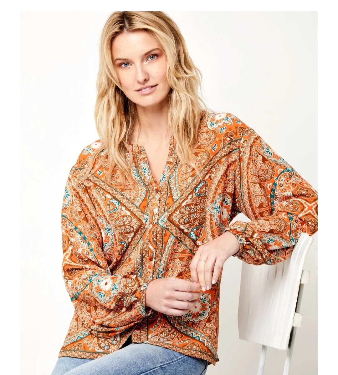 Rose + Olive collared button-up shirt with a colourful paisley and floral print. It's a size large. This top is perfect for adding a vibrant touch to any outfit!