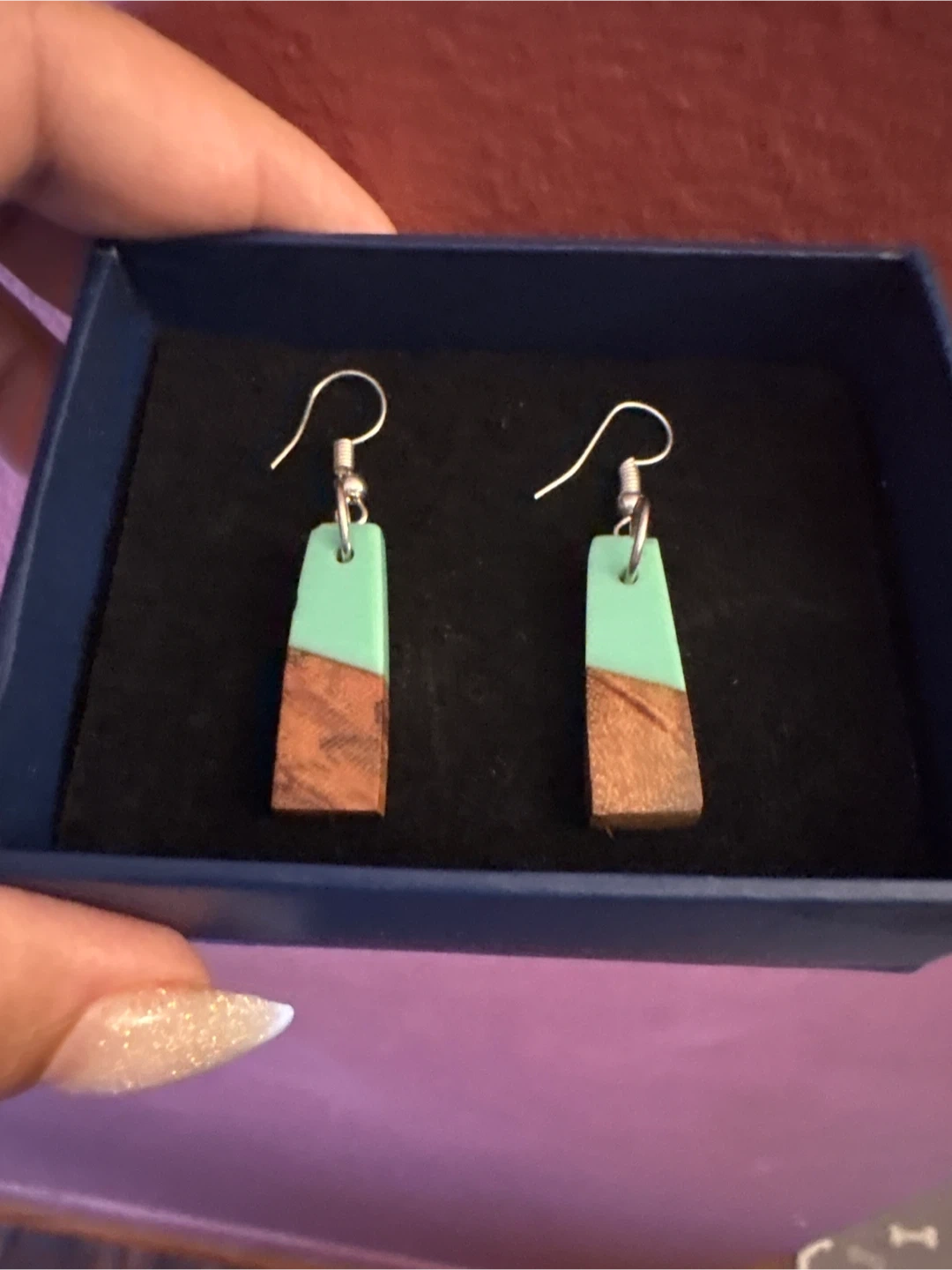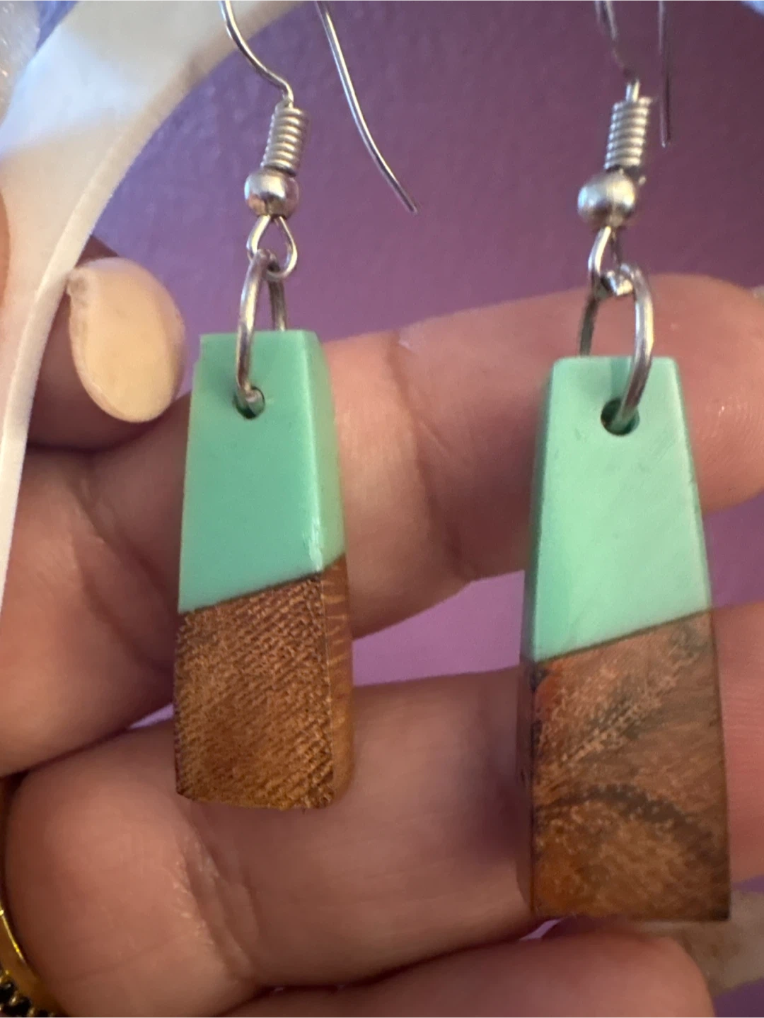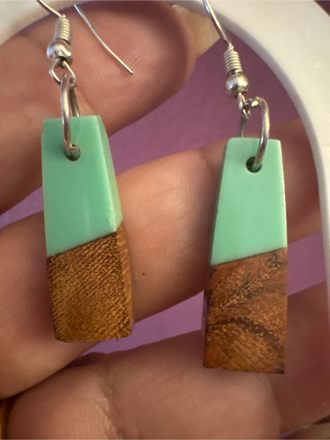 Handmade wood and resin dangle earrings from Fai & Nm Designs. Features a modern geometric design with light green resin and natural wood. Includes original gift box.