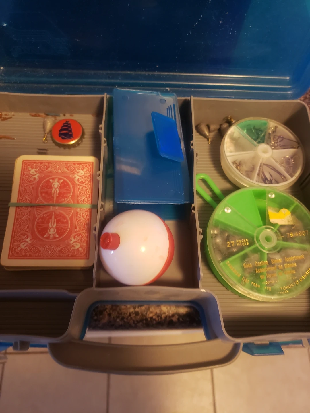 This blue fishing tackle box comes with a variety of lures, bobbers, fishing line, and sinkers. It's organized with multiple compartments for all your fishing needs. A great starter kit for any angler!