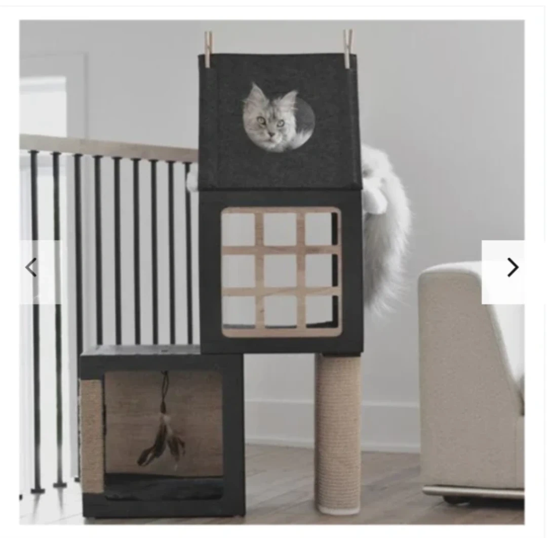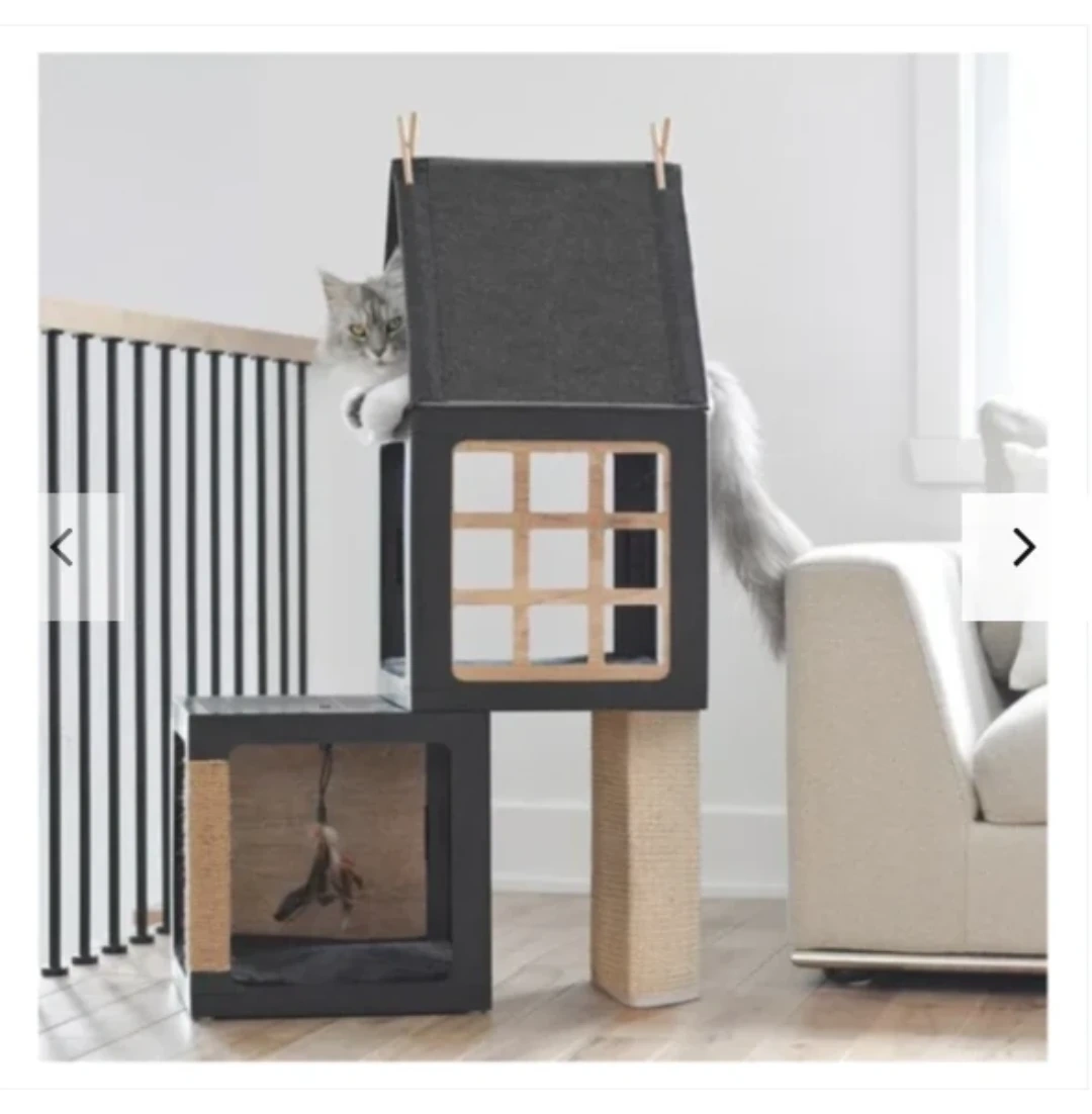 This stylish cat condo offers a cozy spot for your feline friend to relax and play. It features a soft-top perch, platforms to jump on, and a durable scratching post. A feather hanging toy keeps your cat entertained!