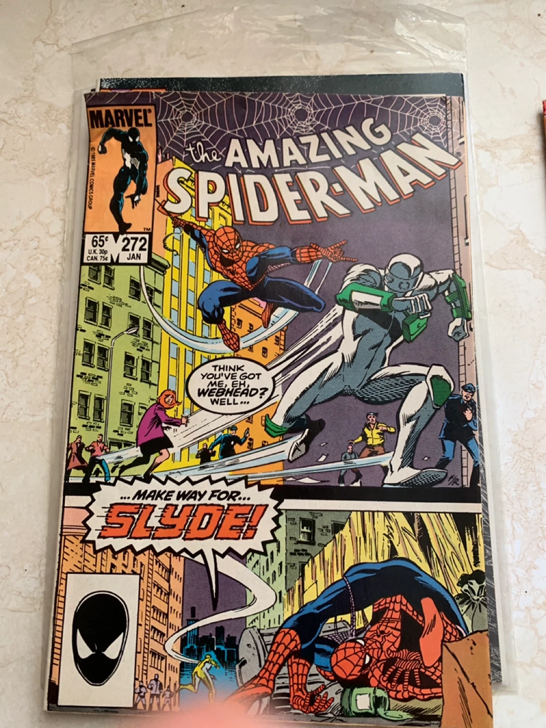 Marvel Comics' The Amazing Spider-Man issue #272 from January 1985. This comic features Spider-Man and the villain Slyde. It's a collectible item for comic book fans.