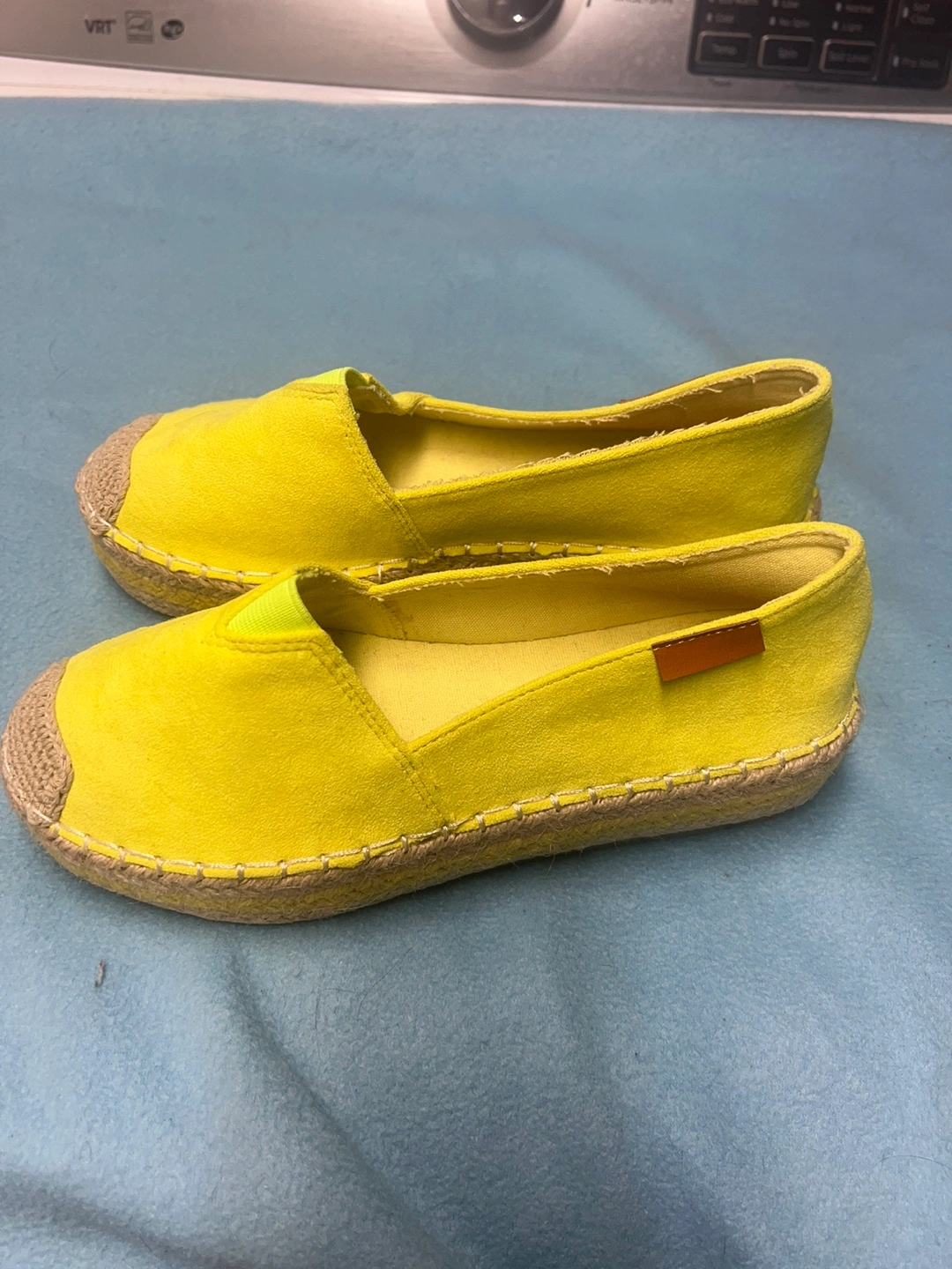 Pair of bright yellow espadrille slip-on shoes. Lightweight and comfortable. Great for summer.