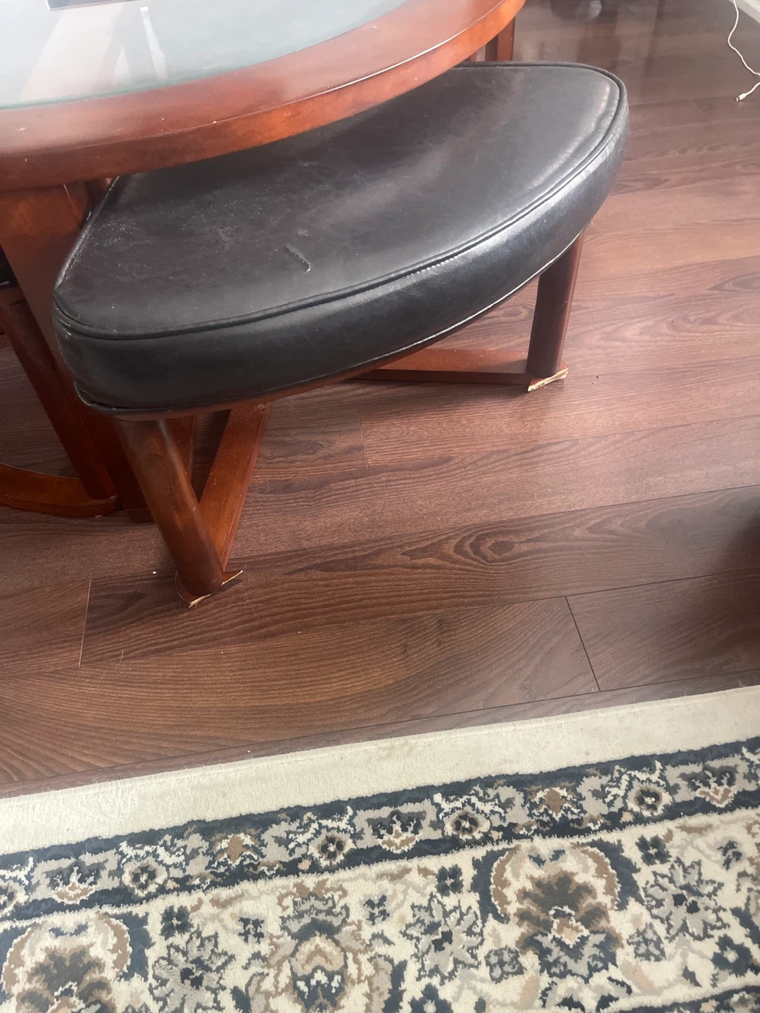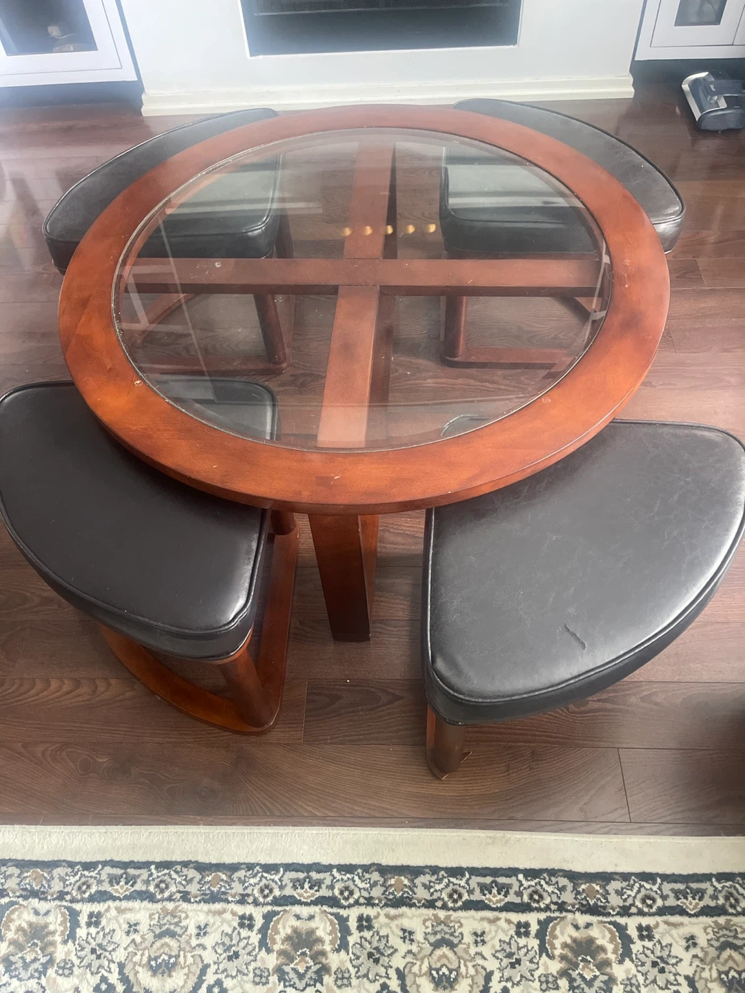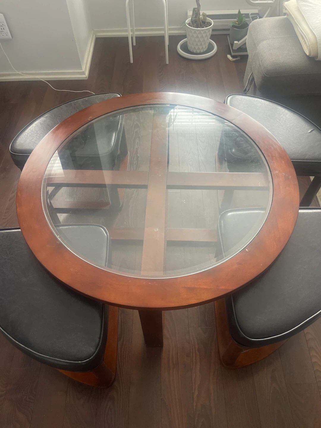 This round dining table features a glass top with a rich wood trim and a sturdy wooden base. It comes with four black faux leather stools that tuck neatly underneath. It's great for small spaces and casual dining!one chair is broken see pictures.
