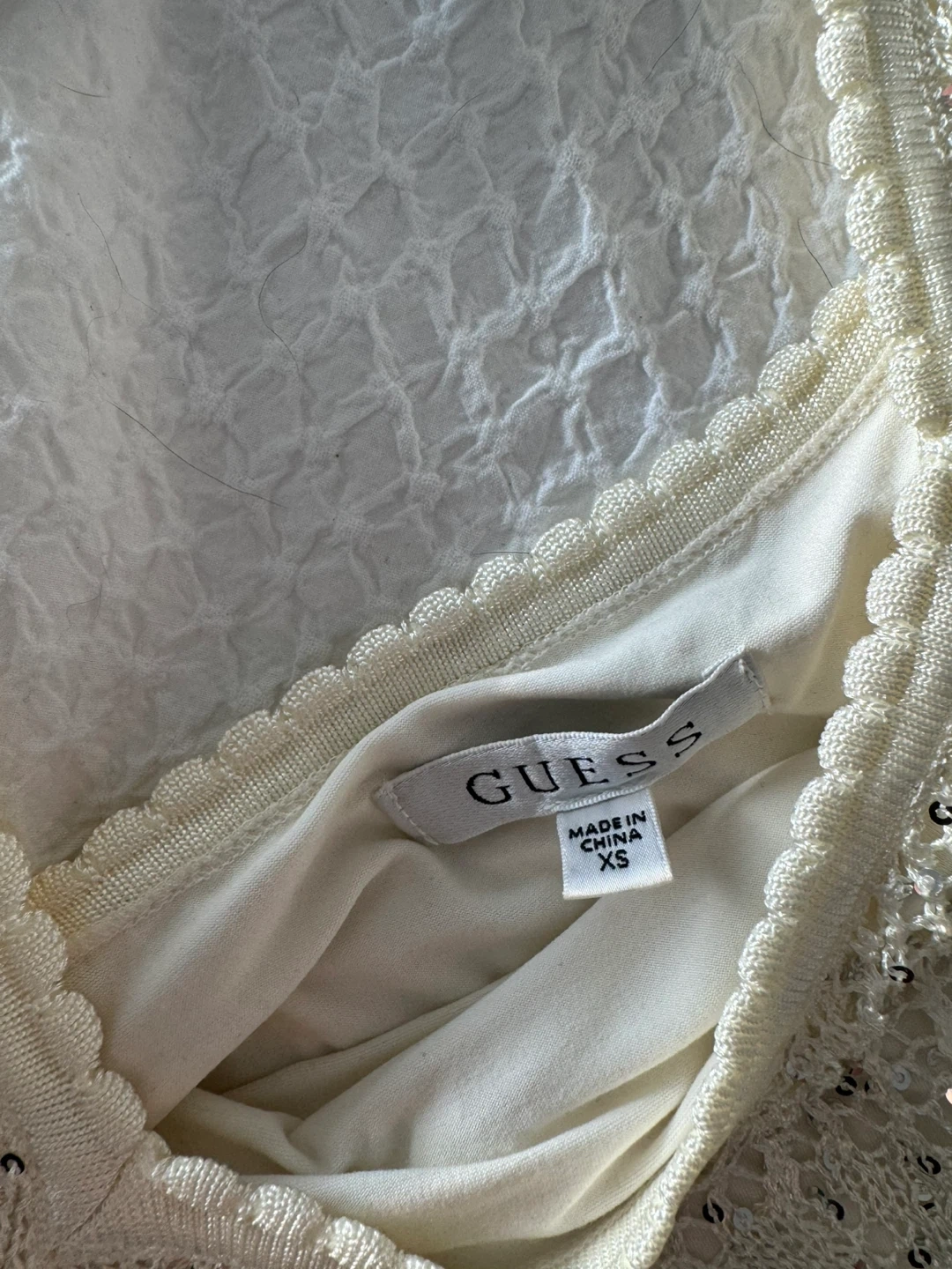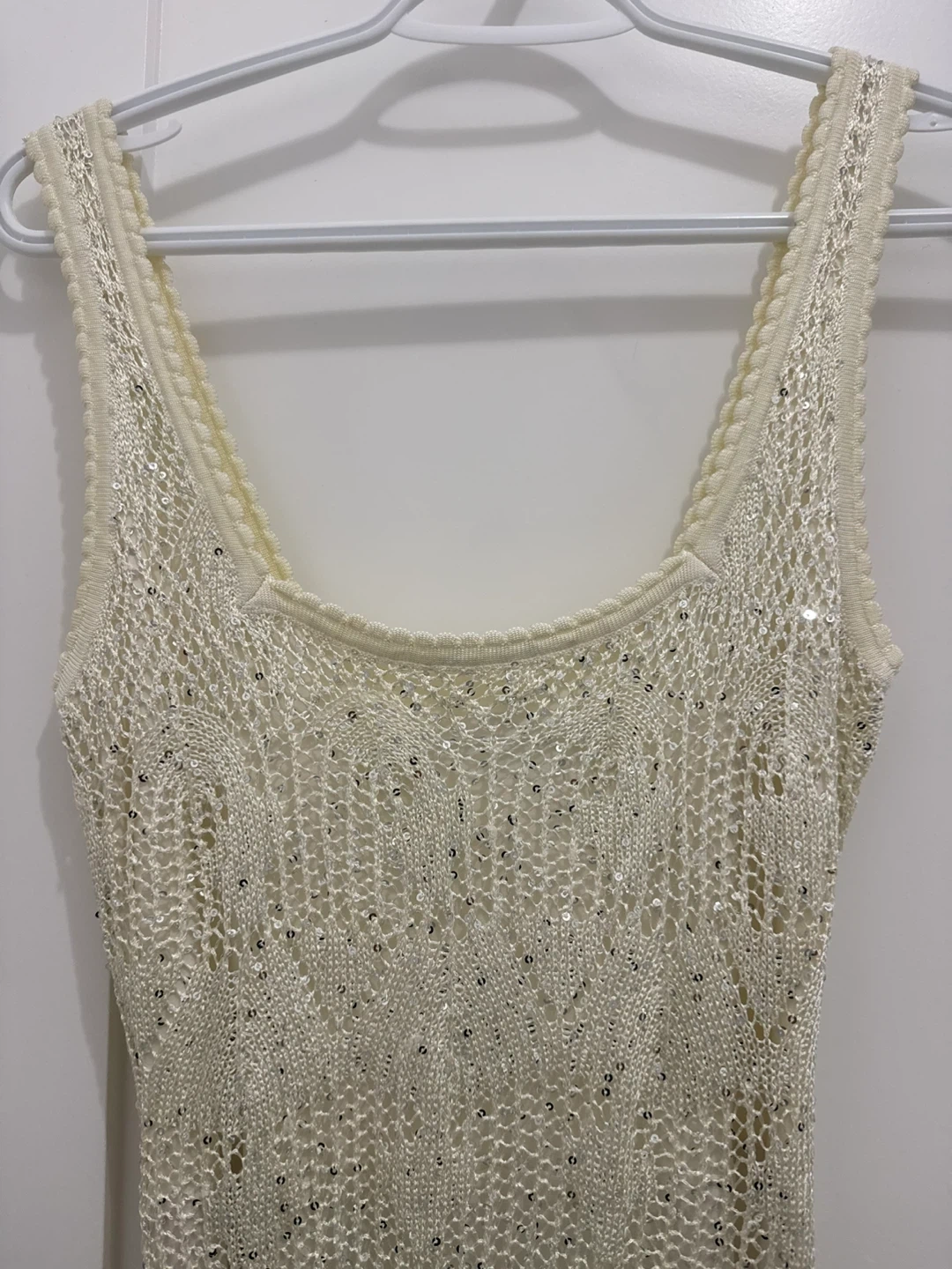 Cream knit tank dress by GUESS. Features sequin detailing throughout the knit fabric. Tank style with a scoop neckline. Size XS.