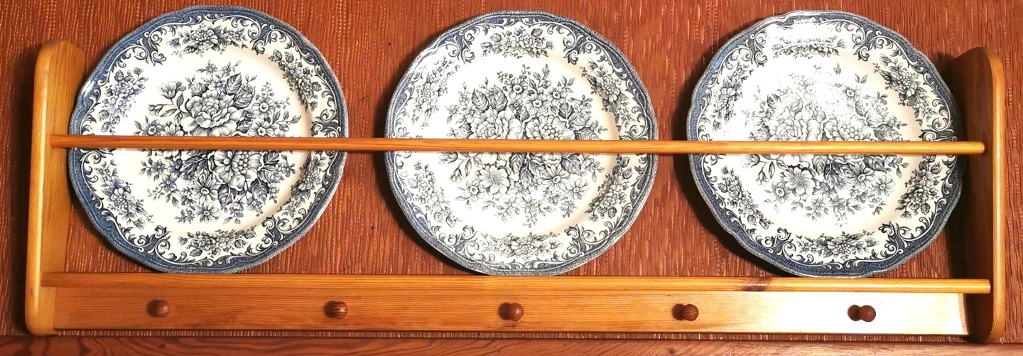 Designed with a classic "Country Kitchen" aesthetic, it features two deep, precision-routed grooves to securely lean and display your favorite dinner plates, platters, or shallow bowls. The lower rail is accented with four sturdy, hand-turned Shaker-style wooden pegs—perfect for hanging mugs, aprons, linens, or herbs.