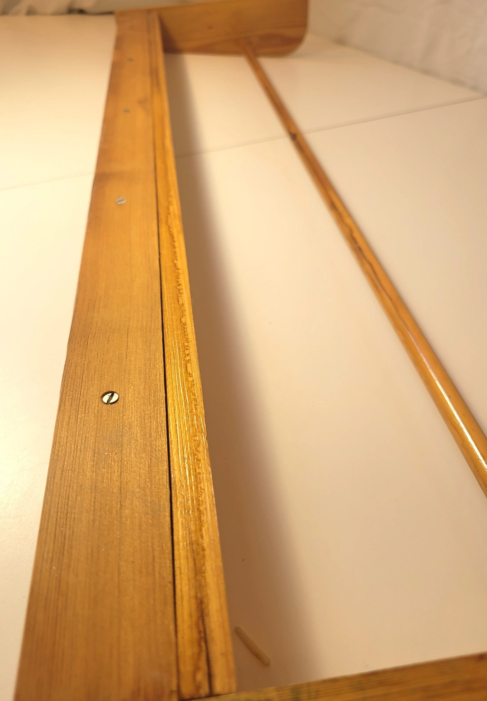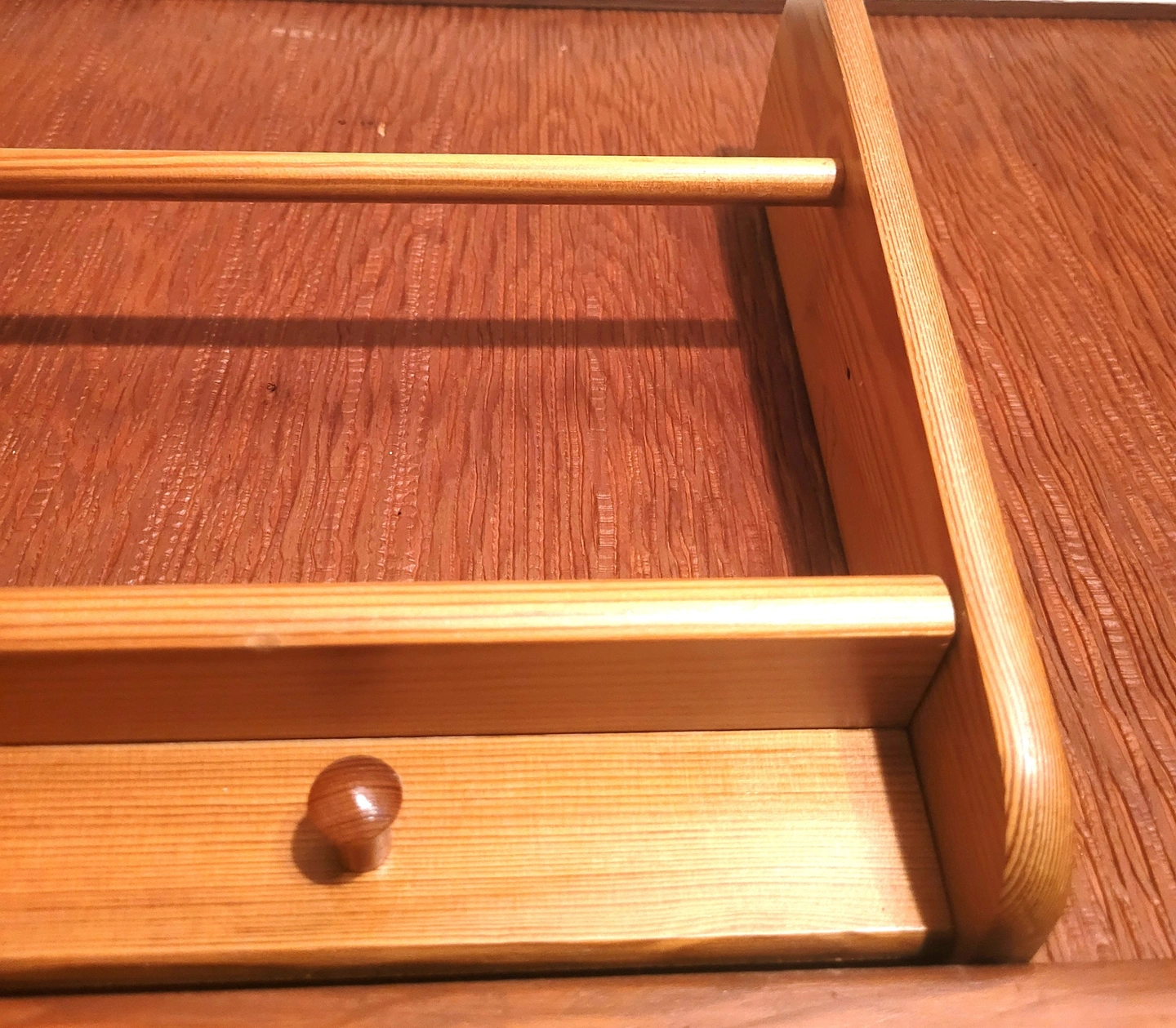 Excellent Vintage Condition. The pine wood has a beautiful, warm honey-toned patina and remains structurally sound with no cracks or warping. There is minor surface wear consistent with a piece from the 1970s, which only adds to its authentic rustic character. Cleaned, conditioned, and ready to be displayed.