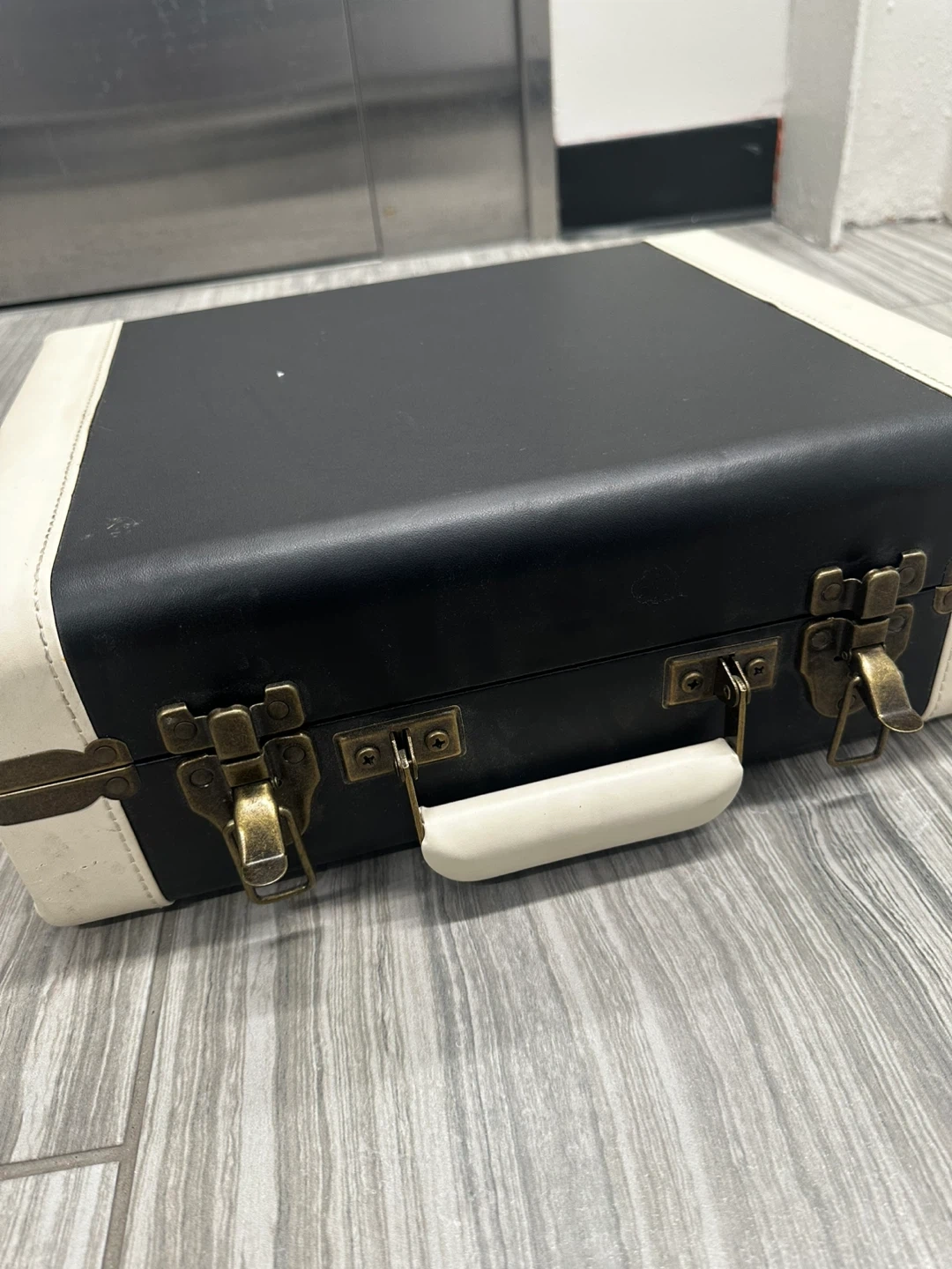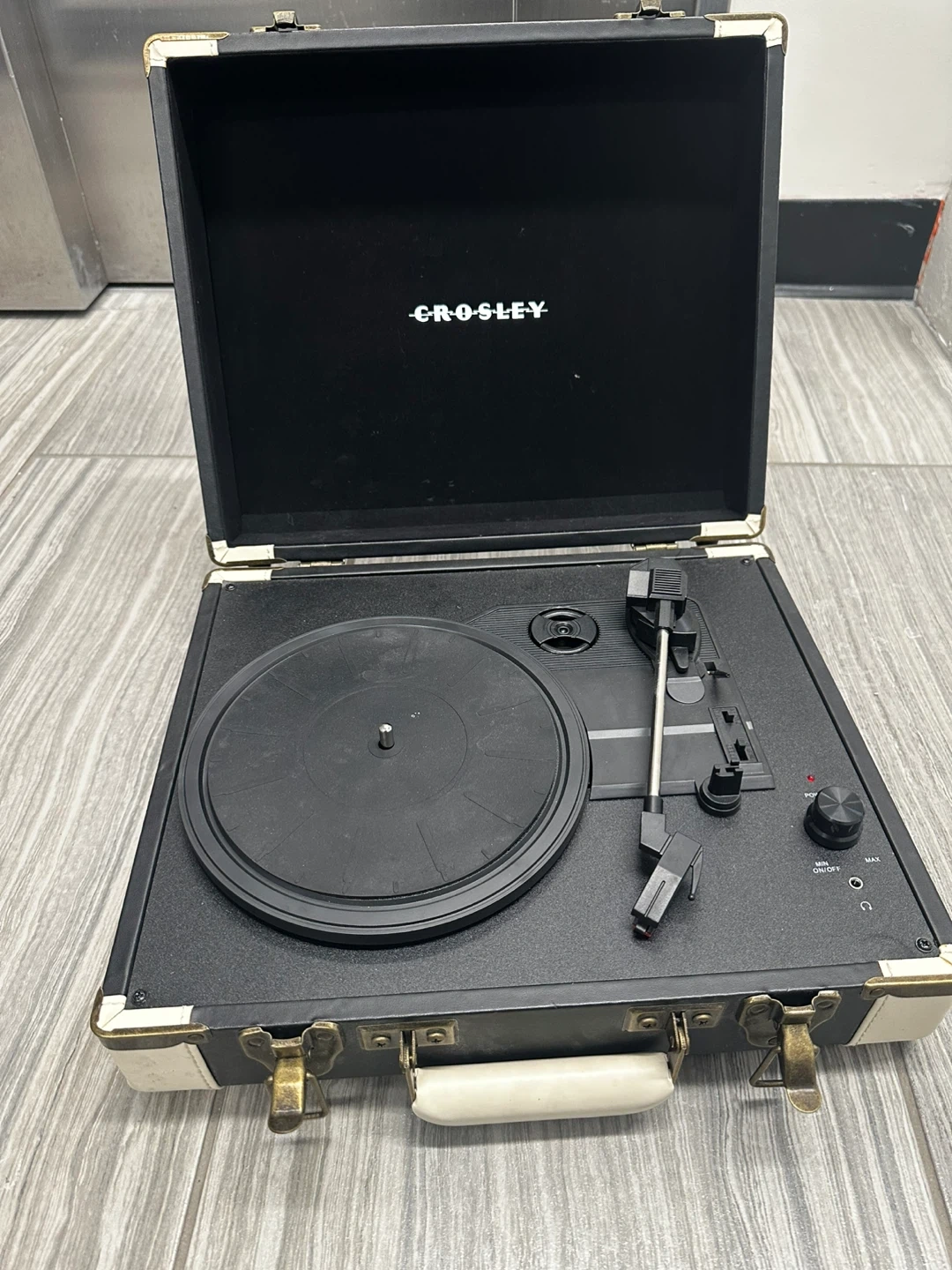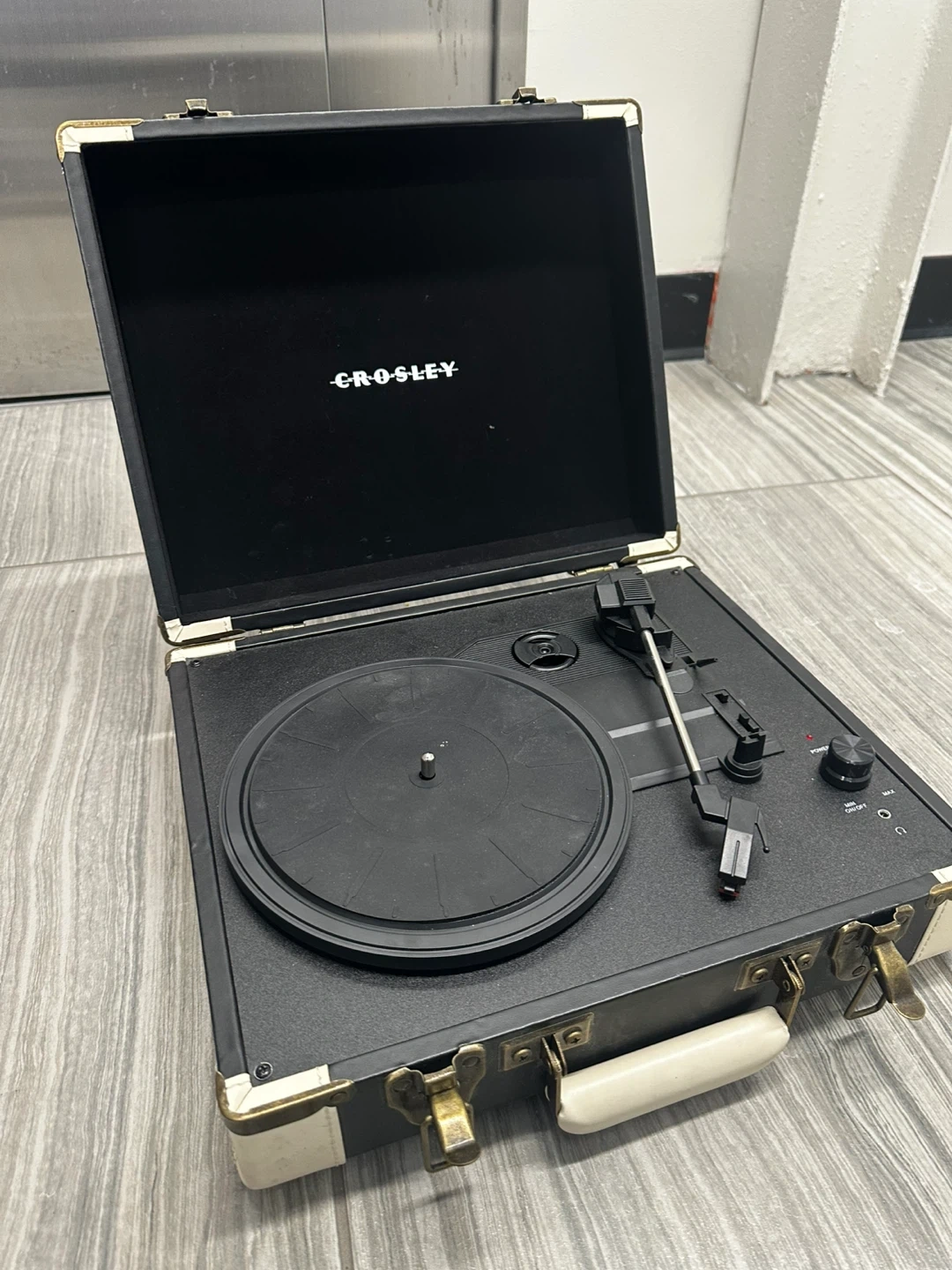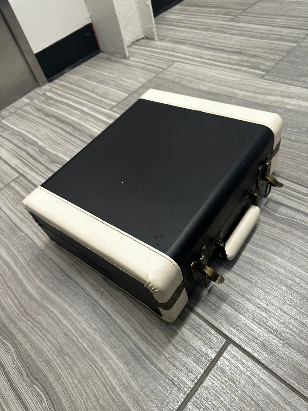 This is a Crosley record player with a black and cream vintage-style case. It's portable and looks like a suitcase when closed. It has a built-in speaker for easy listening.
