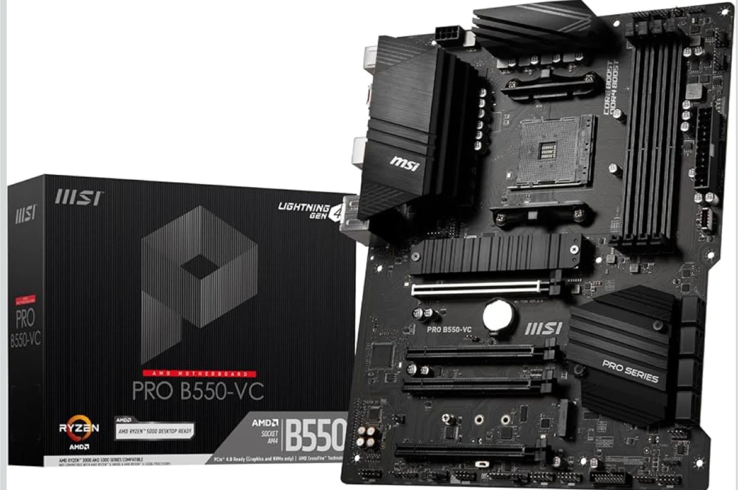 60Selling an MSI PRO B550-VC AMD motherboard. It's compatible with AMD Ryzen 3000 and 5000 series CPUs and supports PCIe 4.0 for graphics and NVMe SSDs. It also features Lightning Gen 4 for fast data transfer!