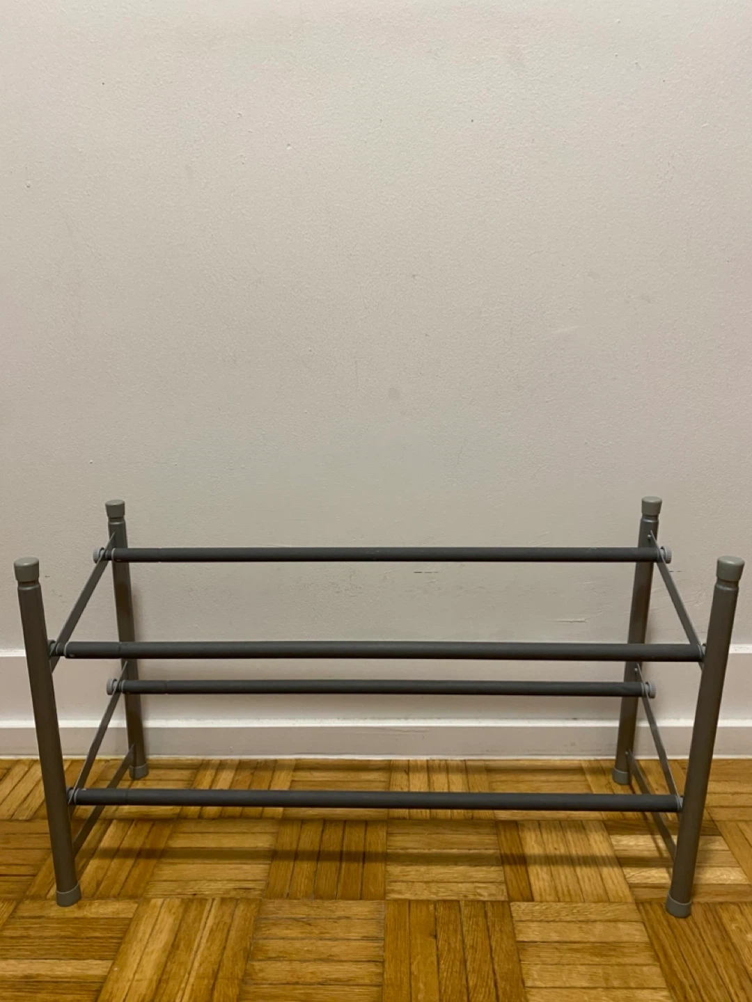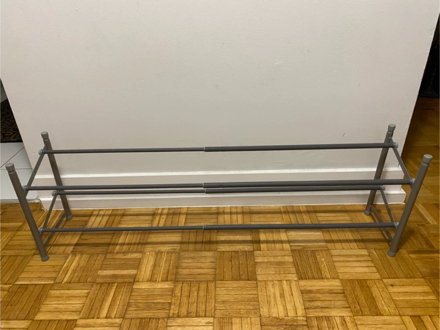 A grey 2-tier metal shoe rack. It's great for organizing footwear in an entryway or closet. This rack provides ample space for your shoes! It expand if required