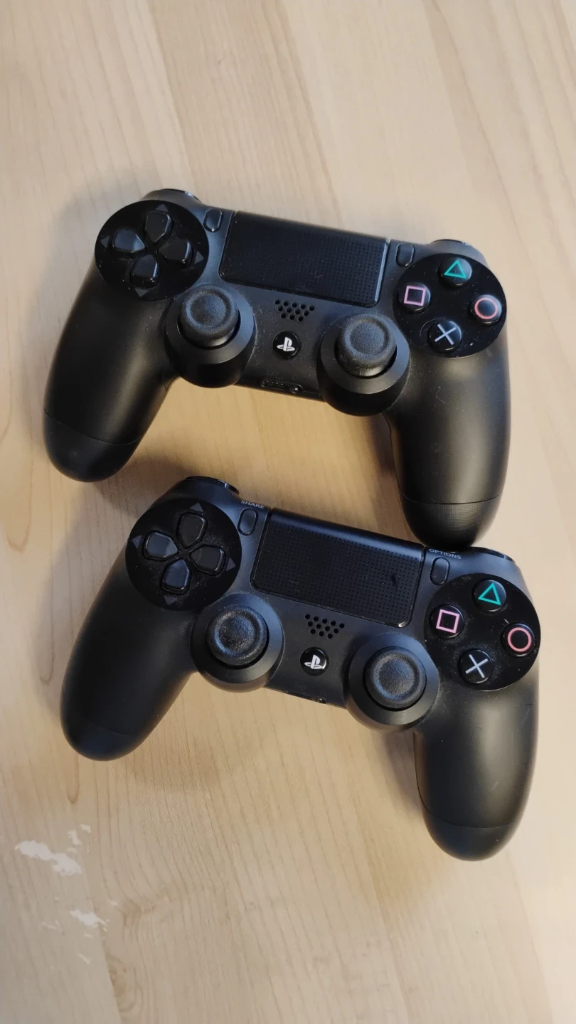 PlayStation 4 console with two controllers, complete with connection cables.