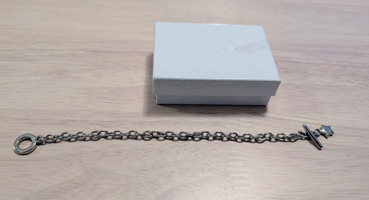 This elegant sterling silver bracelet features a toggle clasp and a charming star charm. It's perfect for adding a touch of sparkle to any outfit. Comes with a box.