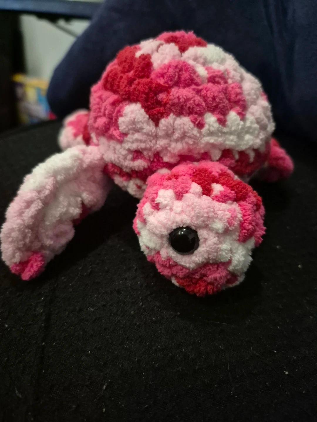 A super cute, handmade crochet turtle plush toy! It's made with soft, chenille-style yarn in a lovely pink, red, and white marbled pattern. This little guy's perfect for cuddling or as a cheerful decoration. It's a fun gift for kids or anyone who loves unique handmade items!