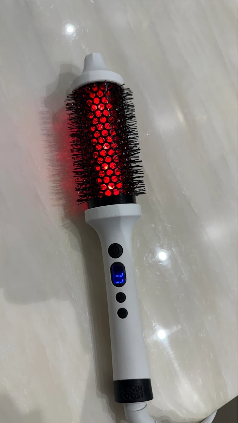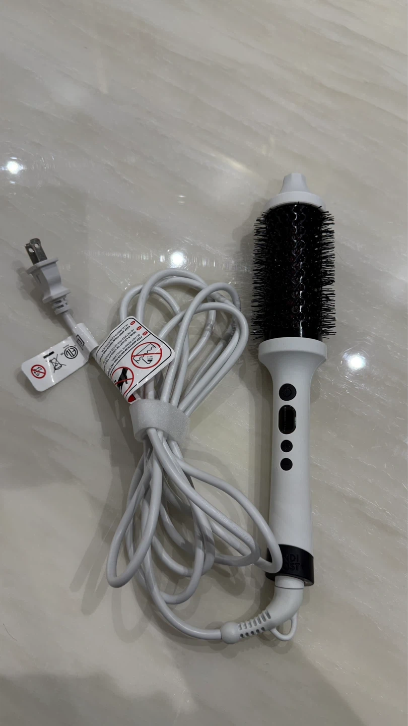 This Bondi Professional rotating hot brush is white with a digital display. It features a heated barrel and comes with its power cord. It's designed for styling hair.only used twice, selling because I have the Dyson.