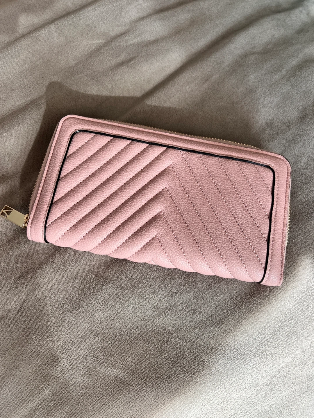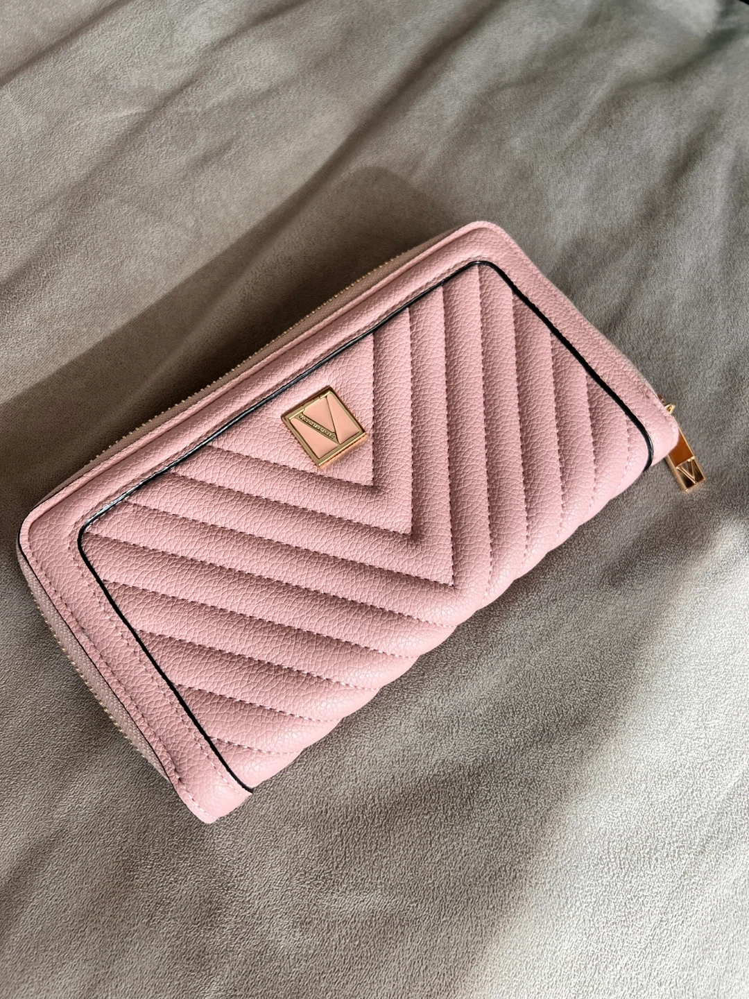 This pink zip-around wallet features a chevron pattern. It's got multiple card slots and a zippered coin pocket inside. A stylish accessory for your everyday essentials!