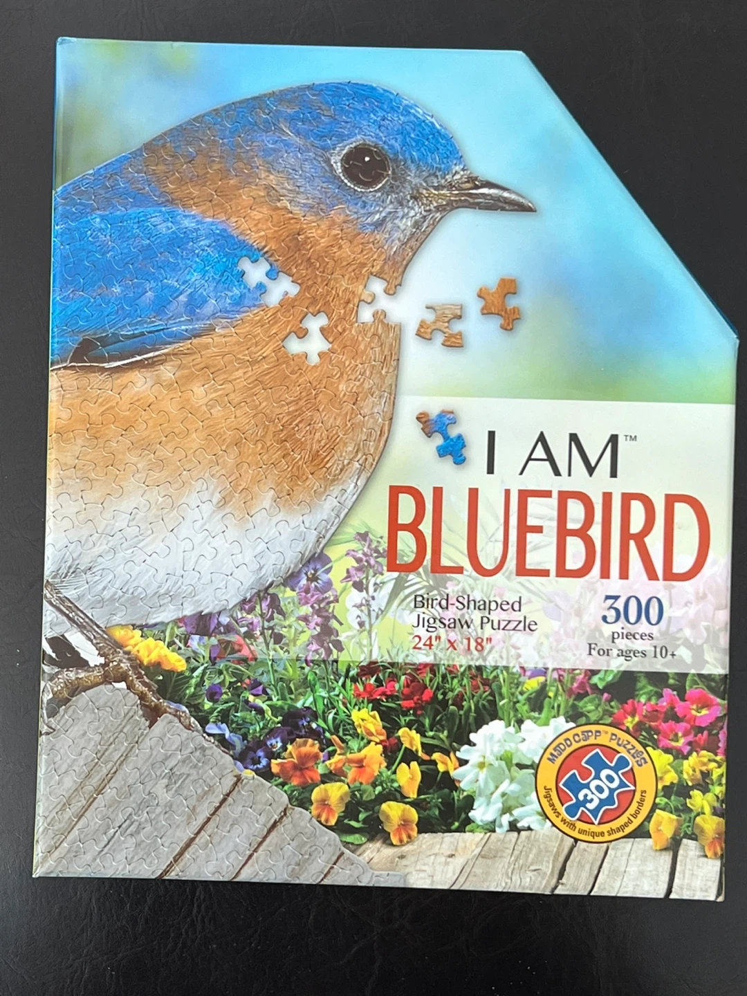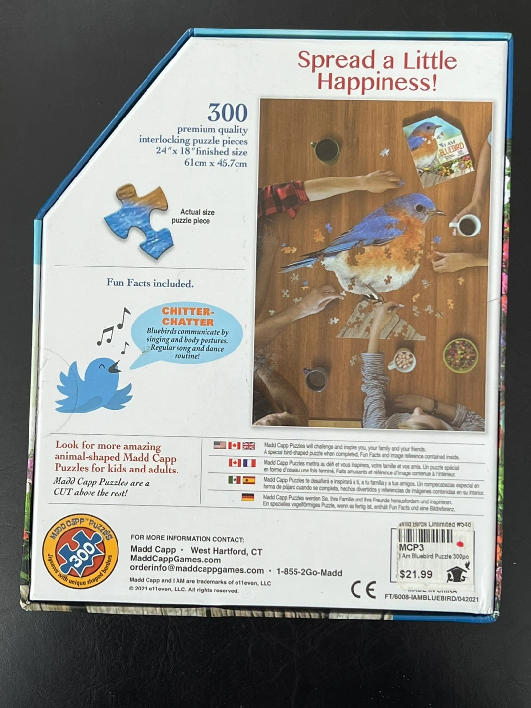This Madd Capp I Am Bluebird jigsaw puzzle has 300 pieces and is shaped like a bluebird! It's finished size is 24 x 18 inches. This puzzle is recommended for ages 10 and up. It includes fun facts about bluebirds. What a fun way to pass the time!