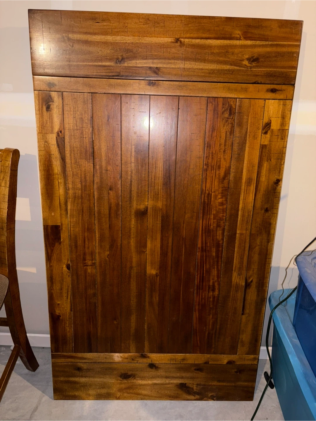 Solid wood table with a warm finish. Includes 2 table leaf inserts. Table has been in storage and is taken apart, all pieces to assemble are taped to the table leg.