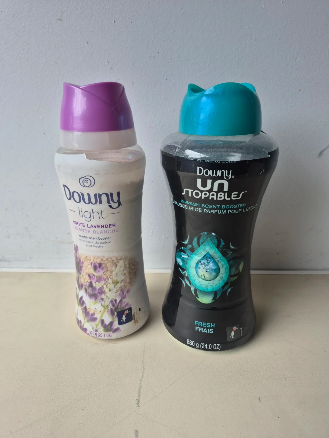 Two bottles of Downy scent boosters, one in White Lavender and the other in Fresh scent. The White Lavender bottle is 281 g (9.9 OZ) and the Fresh scent bottle is 680 g (24.0 OZ).